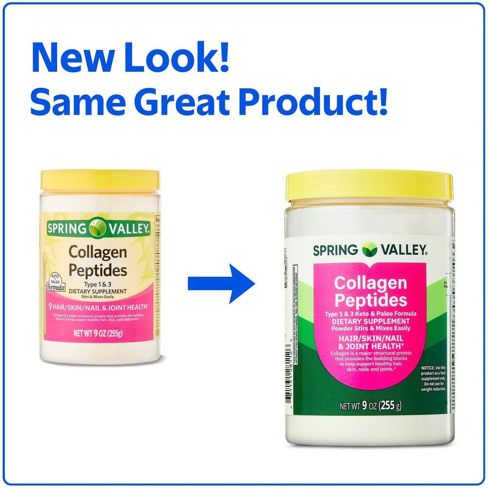 Spring Valley Collagen Peptides Type 1 and 3 Dietary Supplement is your go-to solution for healthy hair, skin, nails, and joints.* This powerful powder stirs and mixes seamlessly into six to eight ounces of water or your favorite juice for easy consumption, and its collagen-packed formula provides the building blocks to help support your health and vitality. Take this unflavored powder with you for an on-the-go boost or a pre- or post-workout drink. You can even opt to whirl it into your favorite smoothie for a special treat. Supplement your healthy lifestyle with the Spring Valley Collagen Peptides Type 1 and 3 Dietary Supplement.* Spring Valley understands living a healthy, balanced lifestyle is the key to being your best self. With an affordable range of products inspired by , Spring Valley supports your and your family's health and holistic wellbeing. Spring Valley Collagen Peptides Type 1 & 3 Dietary Supplement, 9 oz Go-to solution for healthy hair, skin, nails, and joints* No gluten, yeast, wheat, milk, lactose, sugar, soy, or preservatives No artificial color or flavor Stirs and mixes easily 9 oz tub contains about 38 servings Keto and paleo formula *These statements have not been evaluated by the Food and Drug Administration. This product is not intended to diagnose, treat, cure, or prevent any disease