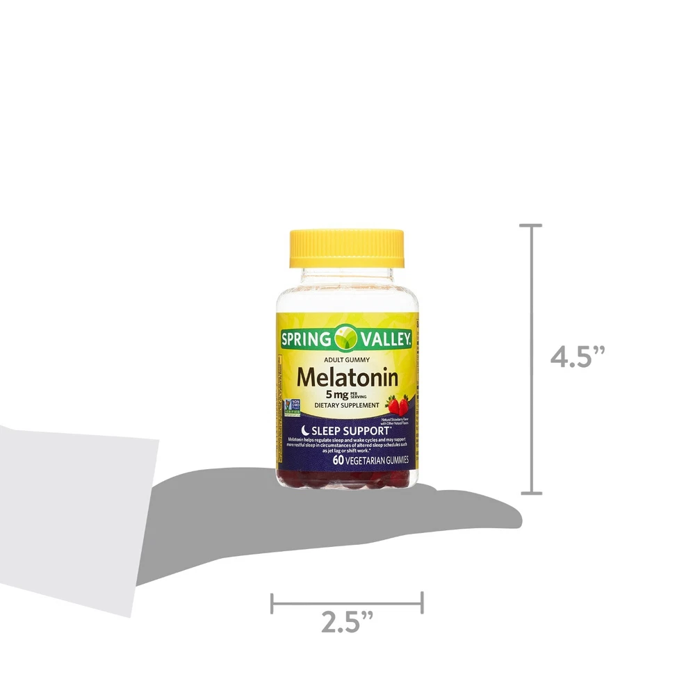 Product details Spring Valley Melatonin Pectin Dietary Supplement Gummies, Strawberry, Spring Valley Pectin-Based Melatonin Gummies are the simplest, best-tasting way to take Melatonin. Our delicious and easy to chew gummies make taking Melatonin a joy. Non-GMO Spring Valley Vegetarian Melatonin Gummies contain 5 mg of Melatonin per serving. Melatonin helps regulate sleep and wake cycles and may support more restful sleep in circumstances of altered sleep schedules such as jet lag or shift work. Take control of your sleep with Spring Valley Pectin-Based Melatonin Gummies. Spring Valley Melatonin Pectin Dietary Supplement Gummies, Strawberry, 5 mg, 60 Count Spring Valley Melatonin Adult Pectin-Based Gummies, 5 mg, 60 count 5 mg of Melatonin per serving Helps regulate sleep and wake cycles May support more restful sleep in circumstances of altered sleep schedules Delicious Easy to take