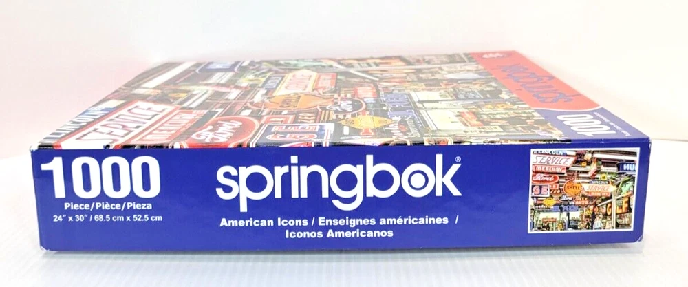 Springbok 'American Icons' 1000 Piece Puzzle. 24"X30" 2014 Nostalgic For those of us who lived through the times, this is a wonderful puzzle, bringing back nostalgic memories. We did not work the puzzle or count the pieces, so we cannot guarantee that all pieces are present. Each item is carefully packaged to prevent any damage and is shipped immediately with tracking.