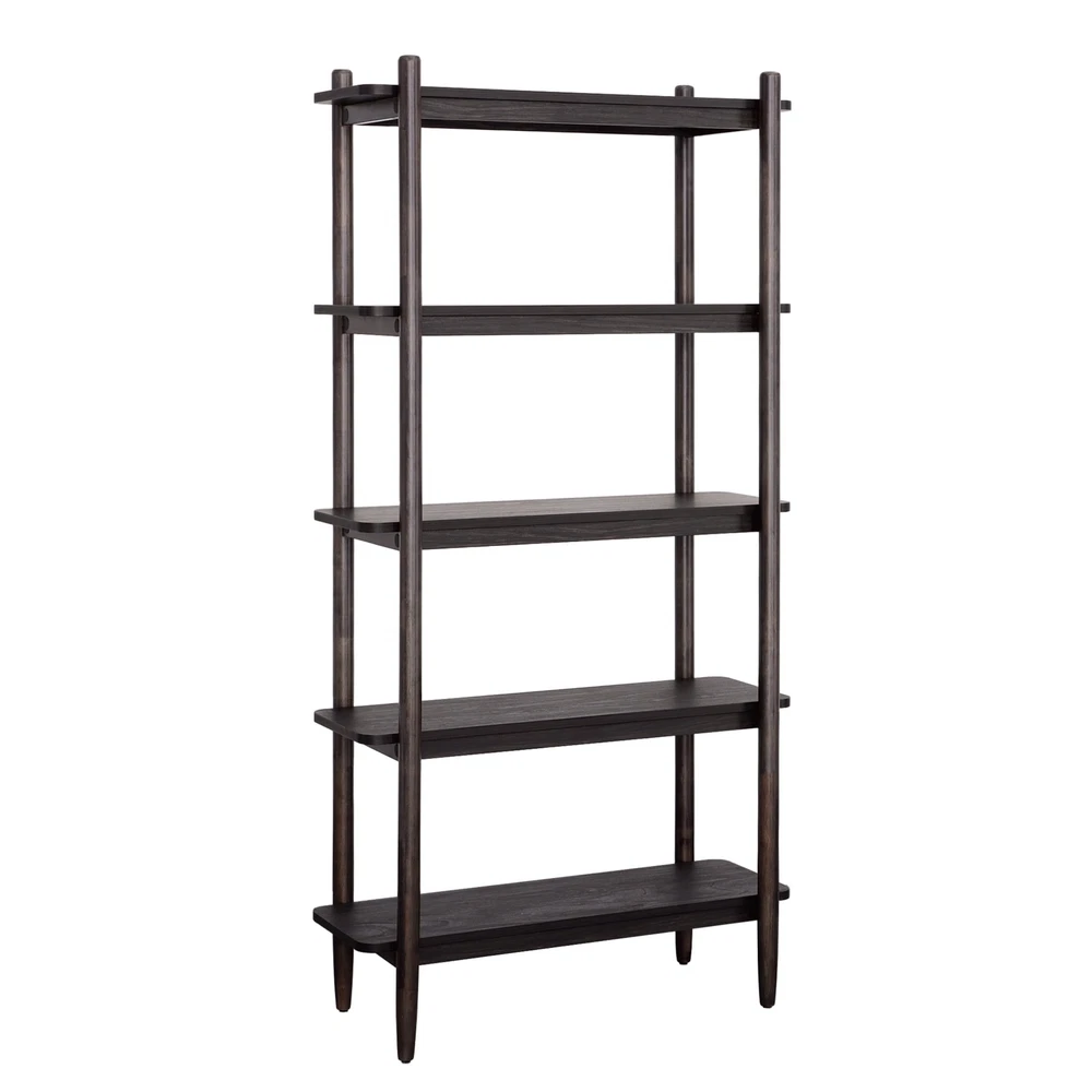 This chic, open bookshelf from the Better Homes & Gardens® Springwood Collection will offer a versatile and trendy solution to any storage dilemma. The large shelves of this 5 shelf bookshelf are a perfect place to display home décor items like decorative plants, an array of knick-knacks and collectibles, and framed photos of your family and friends. Standing on fashionably tapered legs, this tall bookcase with five spacious shelves will provide the room to store a collection of novels, children’s books, or organizing totes or baskets. Mix and match any number of items on this tall, display bookcase. There’s room for everything! Its beautiful and bold design makes this open bookshelf a great addition to the living room, office, or even in the bedroom. Any room in the home will benefit from the neutral tones of this dark, Charcoal finish. Finished on all sides for any angle of placement, this beautiful 5-shelf bookcase will create functional storage solutions without sacrificing style. Assembled Dimensions: 35.98" L X 14.88" W X 71.97" H Open shelving for storage and display Holds books, binders, framed photos, collectibles, and more Solid Wood Accents Charcoal finish Model #: 434761 Box Dimensions: 77.01" L x 17.13" W x 6.89" H