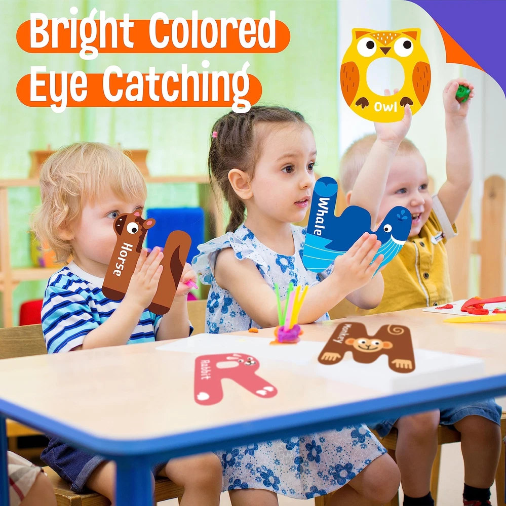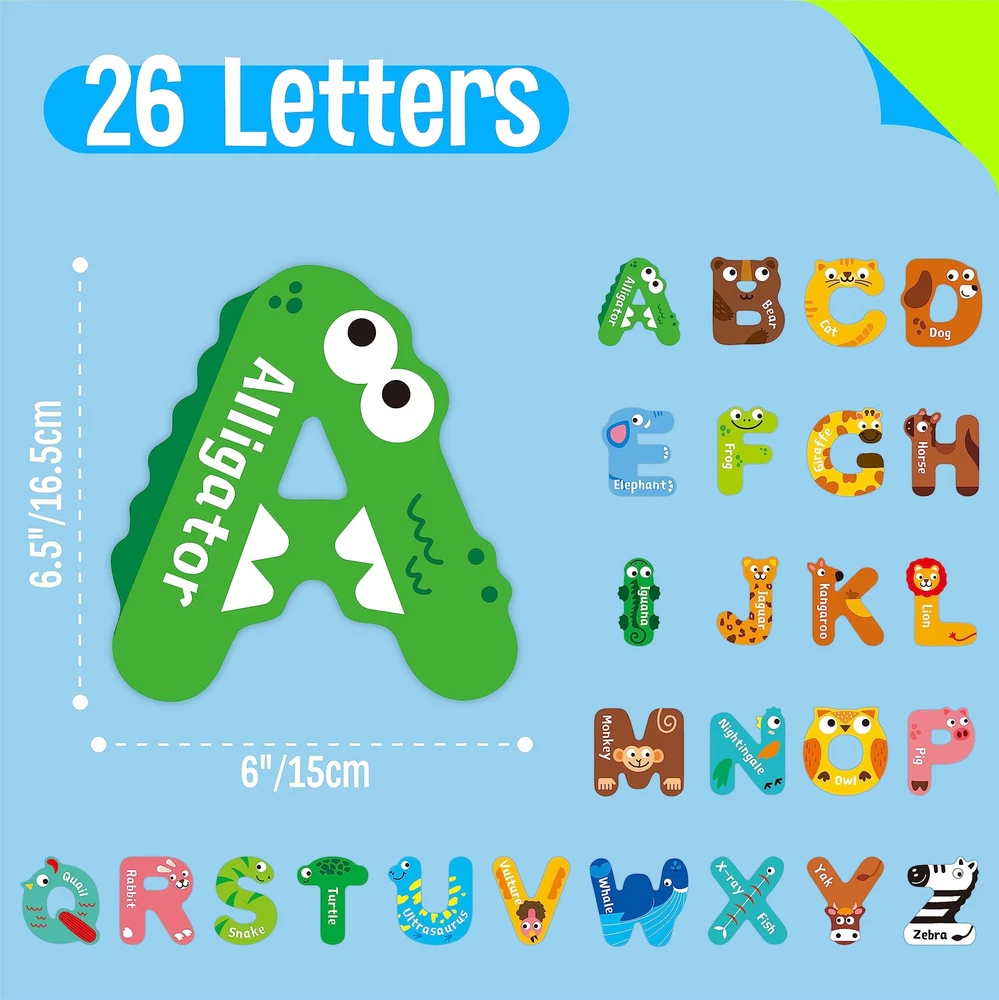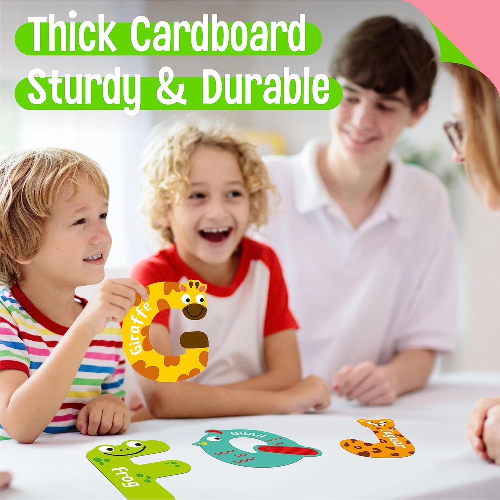 Package Includes: The alphabet poster set comes with 26pcs letter-shaped posters. It adopts individual letter shape with corresponding animal and word, designed to combine education with entertainment, making learning fun and engaging for kids of all ages. It's a versatile learning tool that can help children master the alphabet, improve their vocabulary, and stimulate their linguistic development! Premium Material: The decorations are made of sturdy cardstock, durable and handy. They won't tear easily and will hang nicely and flat. Coated with PET film, waterproof and easy to clean with damp cloth. Printed with premium plant ink, no odd smell and safe to use. It's seamless, lightweight and non-fading. Well Design & Eye-catching: Each poster measures about 6” x 6.5” (15cm x 16.5cm), each letter poster is artistically transformed into a vibrant animal, making the learning experience rich, engaging, and visually stimulating. With a burst of color, imaginative illustrations, and clean, large print, these posters are designed to be eye-catching and appealing to children. Engaging Learning Tool: They help children learn letter recognition, phonics, and animals while fostering their creativity and curiosity. Brighten up your learning space with our visually stunning and educationally potent animal shaped alphabet letter posters. It's not just about decoration; it's about creating a learning environment that's fun, interactive, and exciting. Wide Usages: They serve as an effective learning aid in a classroom setting, helping students to learn and recognize letters, improve their vocabulary and develop their reading skills. For homes, these posters can transform any space into a vibrant learning corner, supporting homeschooling or after-school revision. They're equally useful in a childcare or daycare setting, providing a colorful and educational environment for children.