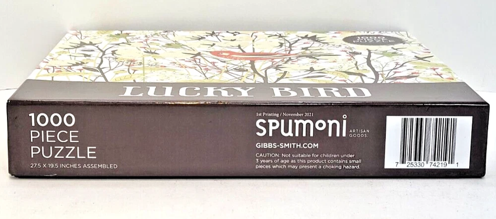 Beautiful artwork is of intermediate difficulty due to color construction. The title is "Lucky Bird" and has 1000 pieces. The puzzle is from Spumoni Artisand Goods. This puzzle is a 1st printing, accomplished in November 2021. It is 27.5" x 19.5" when finished. Doing puzzles has some hidden benefits. Excellent qualities: Cultivate concentration, patience, and temper your will Movement development: Train hand-eye coordination and precise small movements Spatial intelligence: Improve visual discrimination of colors and shapes Critical thinking ability: Understand the relationship between parts and the whole, and draw inferences from one example to explore the future Relax your mind: Relieve work pressure and release yourself Brain development: Enhance memory and prevent brain degeneration We did not work the puzzle or count the pieces, but we verify the number count at your request. Each item we ship is carefully packaged to prevent any damage and is shipped immediately with tracking.