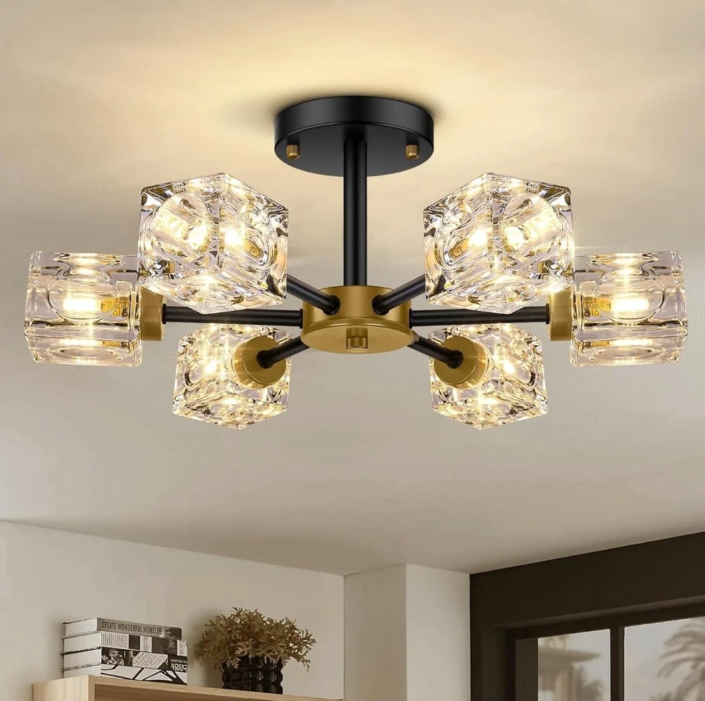 Black Modern Chandelier, 6-Light Crystal Semi Flush Mount Ceiling Light Fixture, 17.3" lFarmhouse Kitchen Pendant Light with Cube Shade, Industrial Sputnik Chandeliers for Dining Room, Bedroom