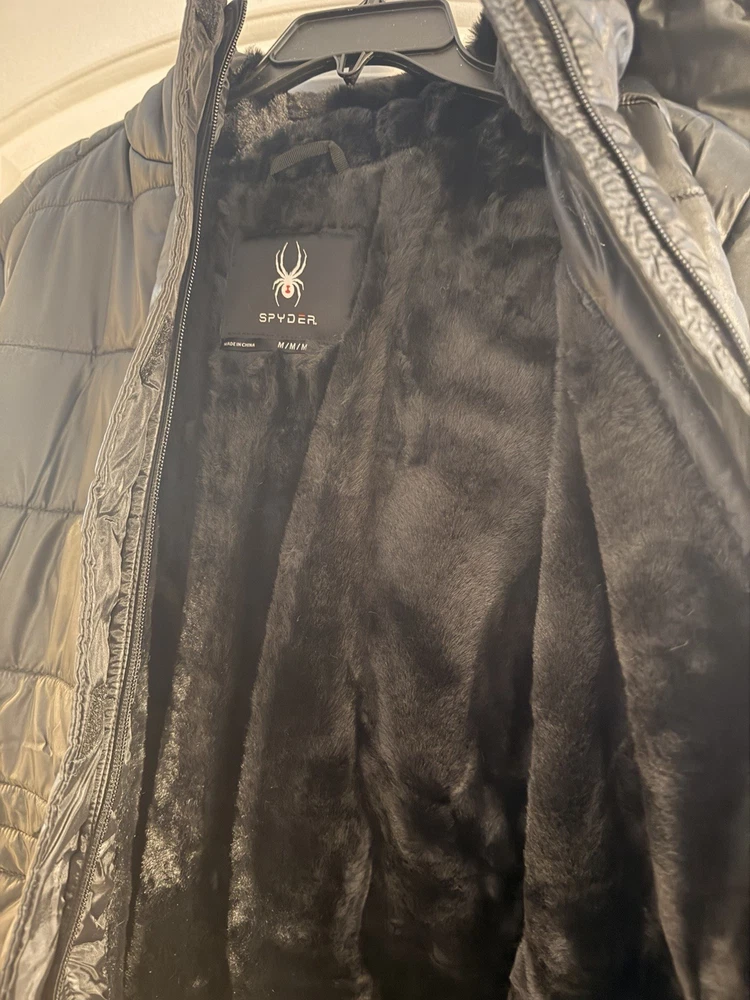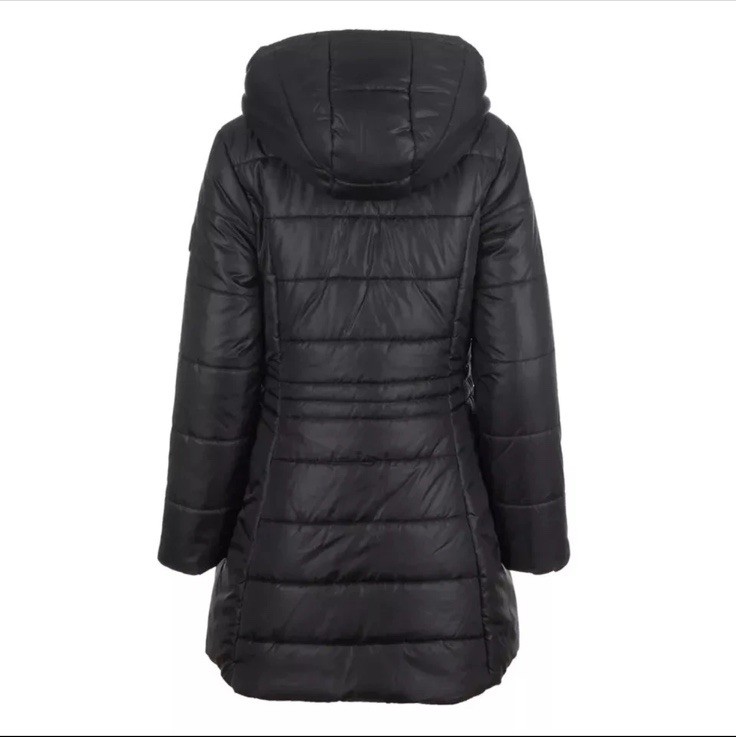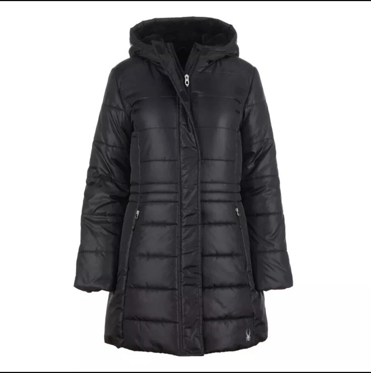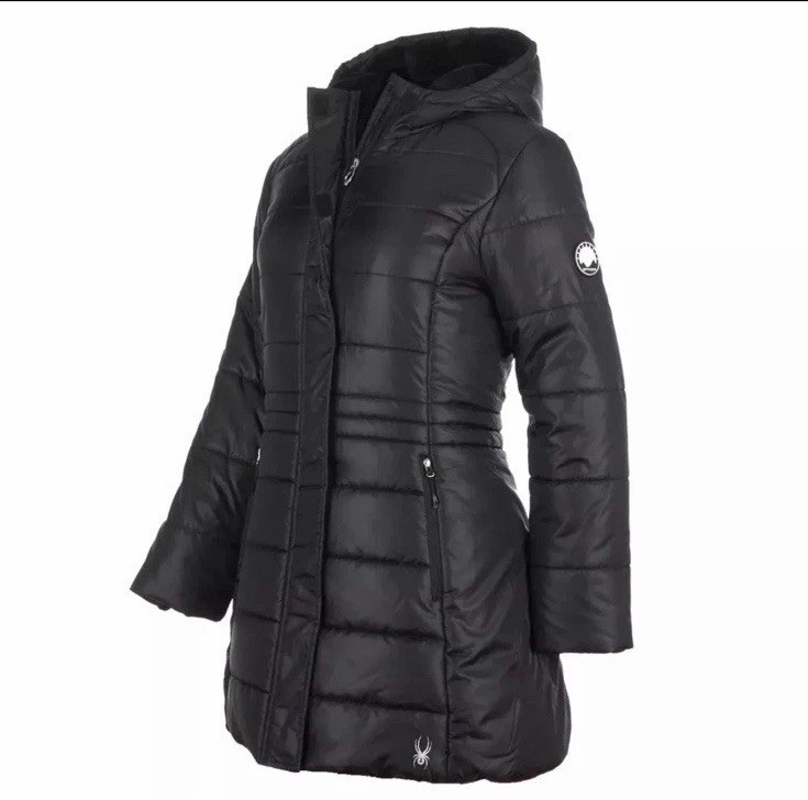 The Spyder Moonbeam Quilted Hooded Full Zip Jacket in black is a stylish and functional outerwear option for women. Made of nylon with a quilted fabric type, this long-length jacket features a full zip closure, hood, and multiple pockets for convenience. Perfect for casual occasions in the winter season, this jacket is windproof, lined, and padded for added warmth and comfort. The Moonbeam model by Spyder offers a regular fit and is designed for outdoor activities, making it a versatile and practical choice for women looking for a winter jacket.