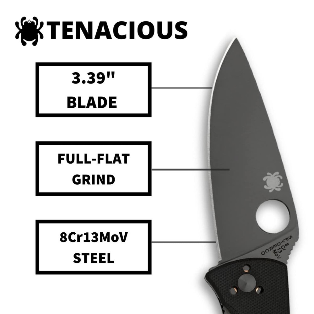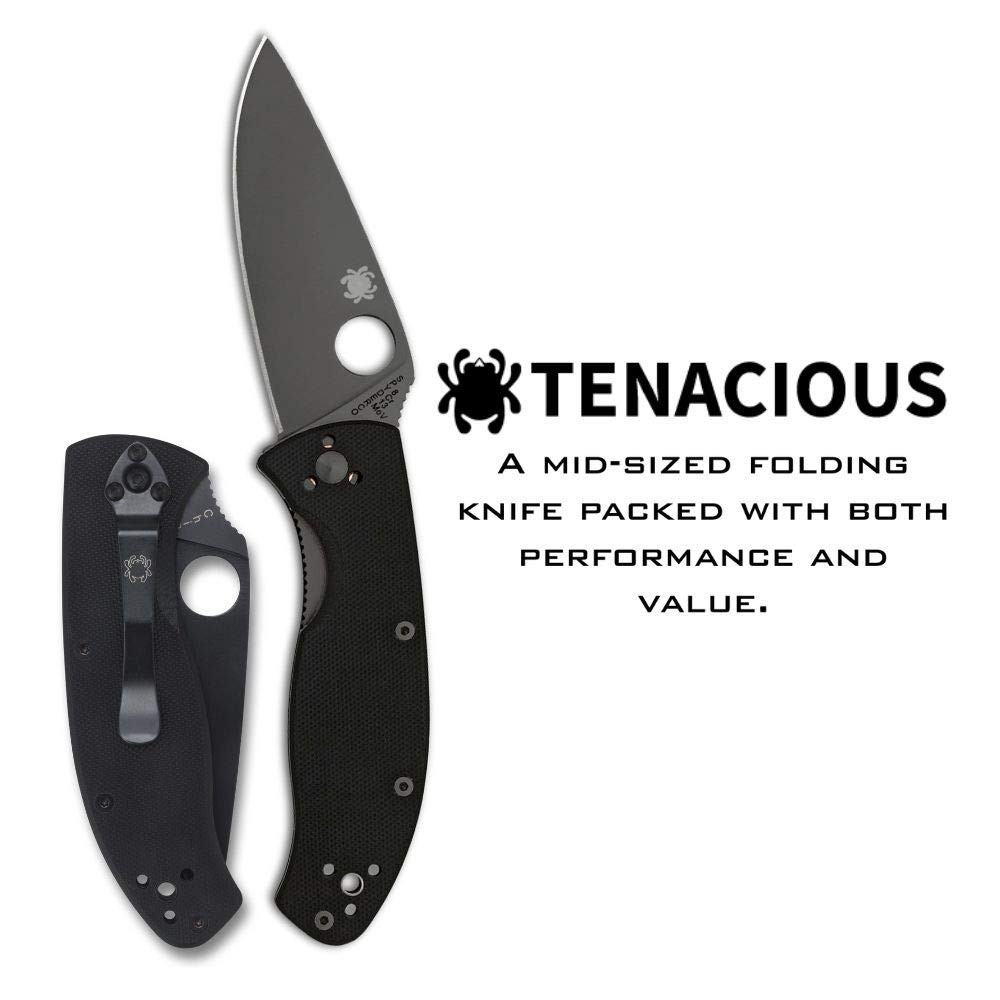 Spyderco Tenacious Folding Utility Pocket Knife with 3.39" Black Stainless Being tenacious means holding fast in tireless pursuit of a goal. This admirable quality is vividly reflected in the Spyderco Tenacious, a mid-sized folding knife packed with both performance and value. Its leaf-shaped blade is full-flat ground from 8Cr13MoV stainless steel and has a fully accessible Trademark Round Hole for ambidextrous one-handed operation. Product Details Brand Spyderco Mpn C122GBBKP Unyielding Performance - The Tenacious embodies persistence and toughness, delivering consistent high performance even under hard-use conditions. Its designed to keep up with the most demanding tasks, making it a reliable everyday companion. Premium Blade Steel - Features a high-performance 3.39" 8Cr13MoV stainless steel blade coated in a black non-reflective finish for superior cutting capability and lasting sharpness, ideal for versatile applications. Lightweight, Secure Grip - Constructed with a G-10 laminate handle, it offers a lightweight yet highly durable grip that resists slipping, while skeletonized steel liners enhance strength without adding bulk. Effortless Operation - The oversized Spyderco Round Hole and textured spine jimping make the blade easy to open and allow for confident thumb placement, ensuring slip-proof precision during any task. Versatile Carry Options - Featuring a reliable linerlock and a black 4-way pocket clip, the Tenacious can be customized for tip-up/tip-down and left-hand/right-hand carry, giving you flexibility in both carry and draw positions. - Powered by