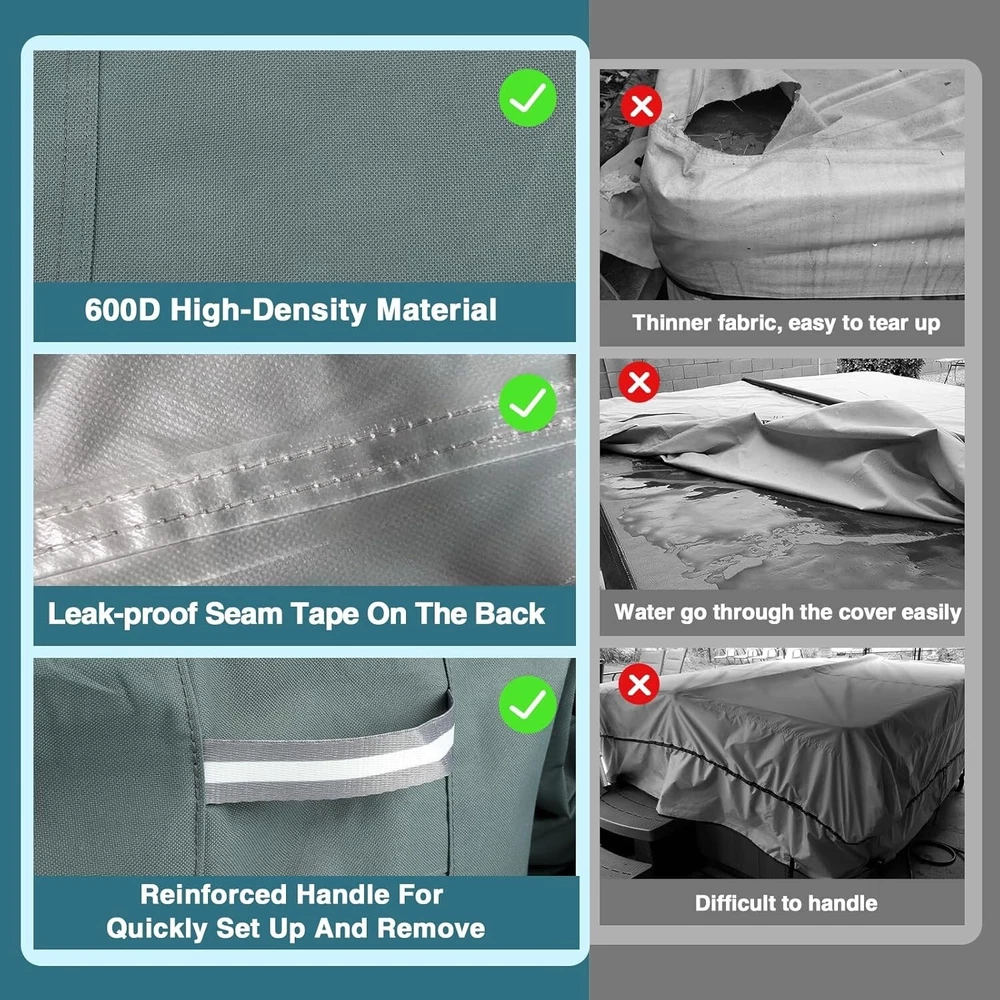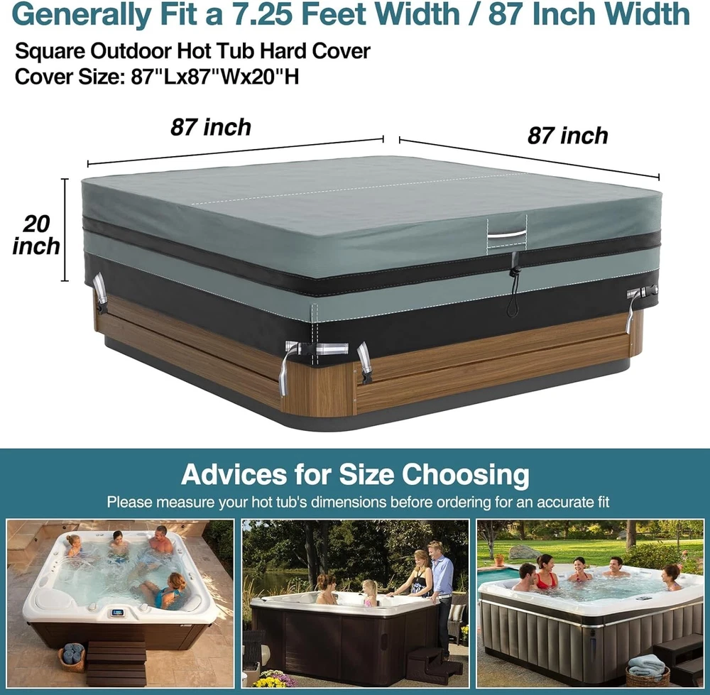 About this item 【 High-quility Durable Material 】- The GREENER hot tub cover is made of heavy duty 600D Oxford fabric with thick PVC coating on the back. The spa cover is waterproof and durable, providing protection against rain, snow, sun and dust, which make sure it can be used outdoor or indoor in different seasons. 【 100% Waterproof & UV Protection】 - Our jacuzzi cover is made of premium waterproof fabric. At the same time, the stitching place is upgraded with waterproof tape seam to ensure that the cover is 100% waterproof. 【 Windproof For All Seasons】 - Heavy duty elastic cords secures the cover for a snug fit over the tub, hook and loop fasteners and Velcro at the bottom allow adjustment for a tight custom fit. Portable handles on both sides designed to quickly place and remove. 【 Breathable Design 】- There are two hidden AIR VENTS on two sides of the spa cover for hot tub to ensure air circulation. Effectively prevents moisture accumulation and wind lofting. 【 Universal Size】 - GREENER hot tub/spa cover provide perfect protection to your outdoor hot tub. Cover size:87"(W)*87"(L)*20"(H).General suitable for square hot tubs with a side length not greater than 87 inches. 【 Customer After-sales Service 】- We are committed to providing you with quality products and providing you with impeccable customer
