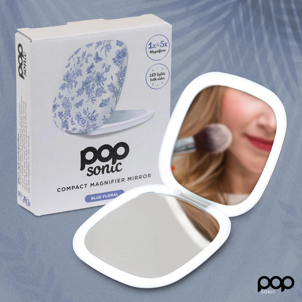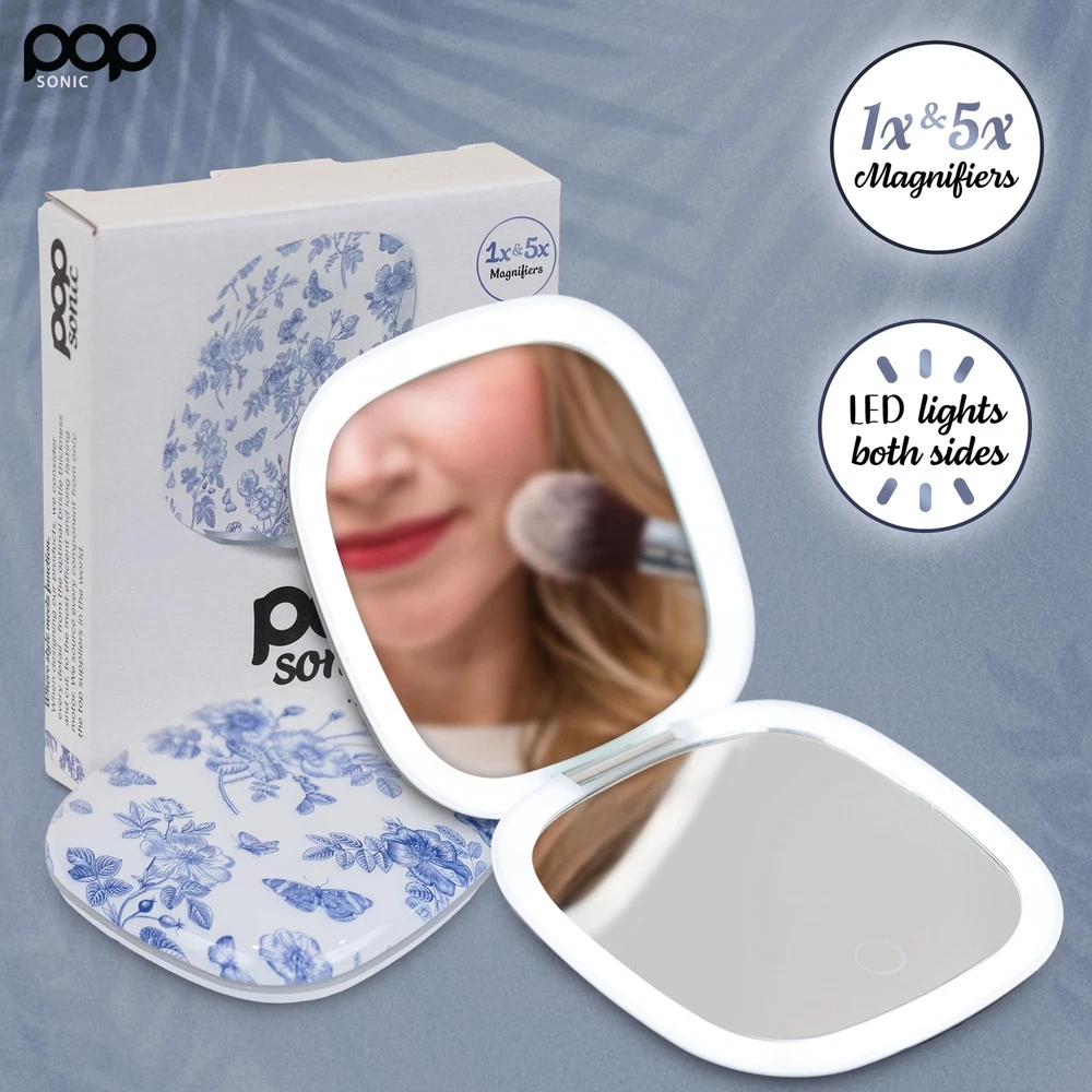 Square LED Compact Mirror - Adjustable Brightness Light Up Travel Mirror w/ 1x/5x Magnifiers - Portable Makeup Mirror w/Dual-Sided LED Lights (Blue Floral) Product Details Color: Blue Floral Brand: Pop Sonic MPN: P_S_SM UPC: 819573024791 EAN: 0819573024791 Brand: Pop Sonic Room Type: Home Office Shape: Square Product Dimensions: 5"L x 5"W Frame Material: Plastic Brand: Pop Sonic Room Type: Home Office Shape: Square Product Dimensions: 5"L x 5"W Frame Material: Plastic Style: Classic Mounting Type: Floor Mount Finish Type: Painted Surface Recommendation: Hard and Flat Surface Special Feature: Portable Color: Blue Floral Theme: Floral Specific Uses For Product: Makeup, Skincare, Travel Number of Pieces: 1 Number of Items: 1 Material: Plastic Frame Type: Framed Item Weight: 8 ounces Assembly Required: No Frame Color: Blue Manufacturer: Pop Sonic UPC: 819573024791 Country of Origin: China Item model number: P_S_SM Date First Available: September 23, 2020 Light Up Compact Mirror: Boost your beauty routine with our led compact makeup mirror. This square portable mirror with lights features 1x/5x magnifiers, dual-sided LEDs, and a rechargeable cable is your perfect beauty companion, wherever life takes you! Adjustable Brilliance: Our Pop Sonic compact mirror will Illuminate with ease by long-press for your preferred brightness. This square travel LED mirror has an easy touch button control to elevate your makeup and skincare routine anytime, anywhere! Continuous Rechargeability: This compact magnifying mirror with light features a rechargeable cable, ensuring seamless on-the-go charging. Our magnifying travel mirror uninterrupted moments of radiance and beauty enhancement, are always prepared for your glowing beauty. Versatile Utility: This square rechargeable makeup mirror with lights is your reliable beauty essential, ready to accompany you for every occasion. Our cute compact mirror ensures flawless makeup or skincare routines whenever you need them! Folding Design: The Foldable pocket mirror for purse design allows this mirror to fit Perfectly in Purses, Makeup Cases, and Travel Bags, making the foldable mirror with lights your essential companion for beauty on the go, wherever your adventures take you.