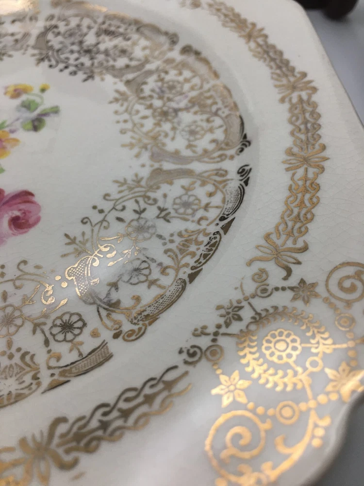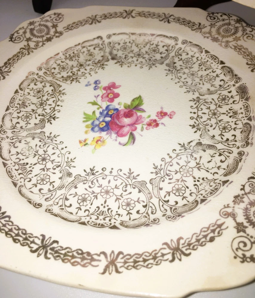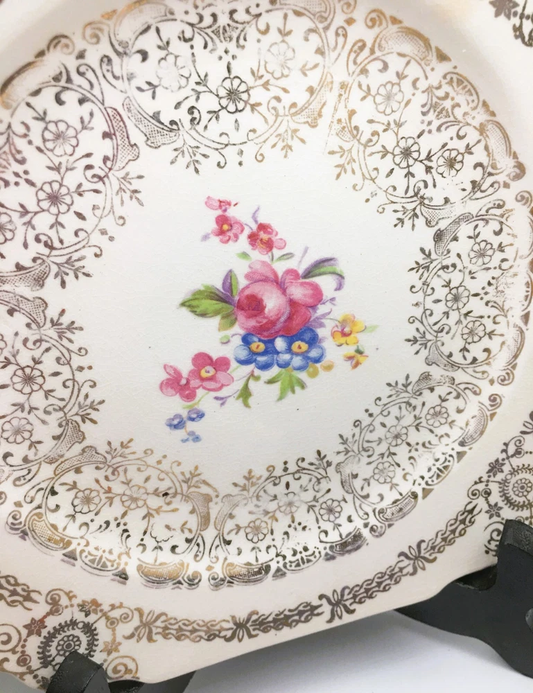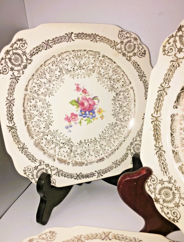 Vintage Set of 3 Square Salad Plates 22K Gold Ornate Details with roses and scrolls ~ Lovely filigree pattern that catches the light (see photos) Pink & multicolored floral bouquet in the center of each plate with cabbage roses Measure 6 1/2" diameter Unmarked ~ pattern name unknown although reminiscent in style of Limoges, Sebring, American Limoges in the 1930s...could be any of those but I'm not certain as they are not marked No chips or cracks. Minor crazing. Please see photos and zoom if for clarity. This is a beautiful set for display or replacement! Carefully packed and shipped by Daisy!