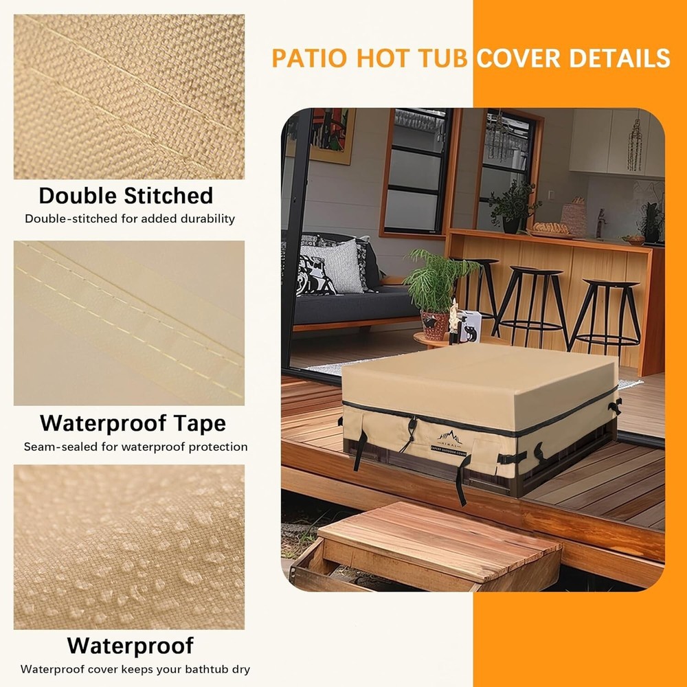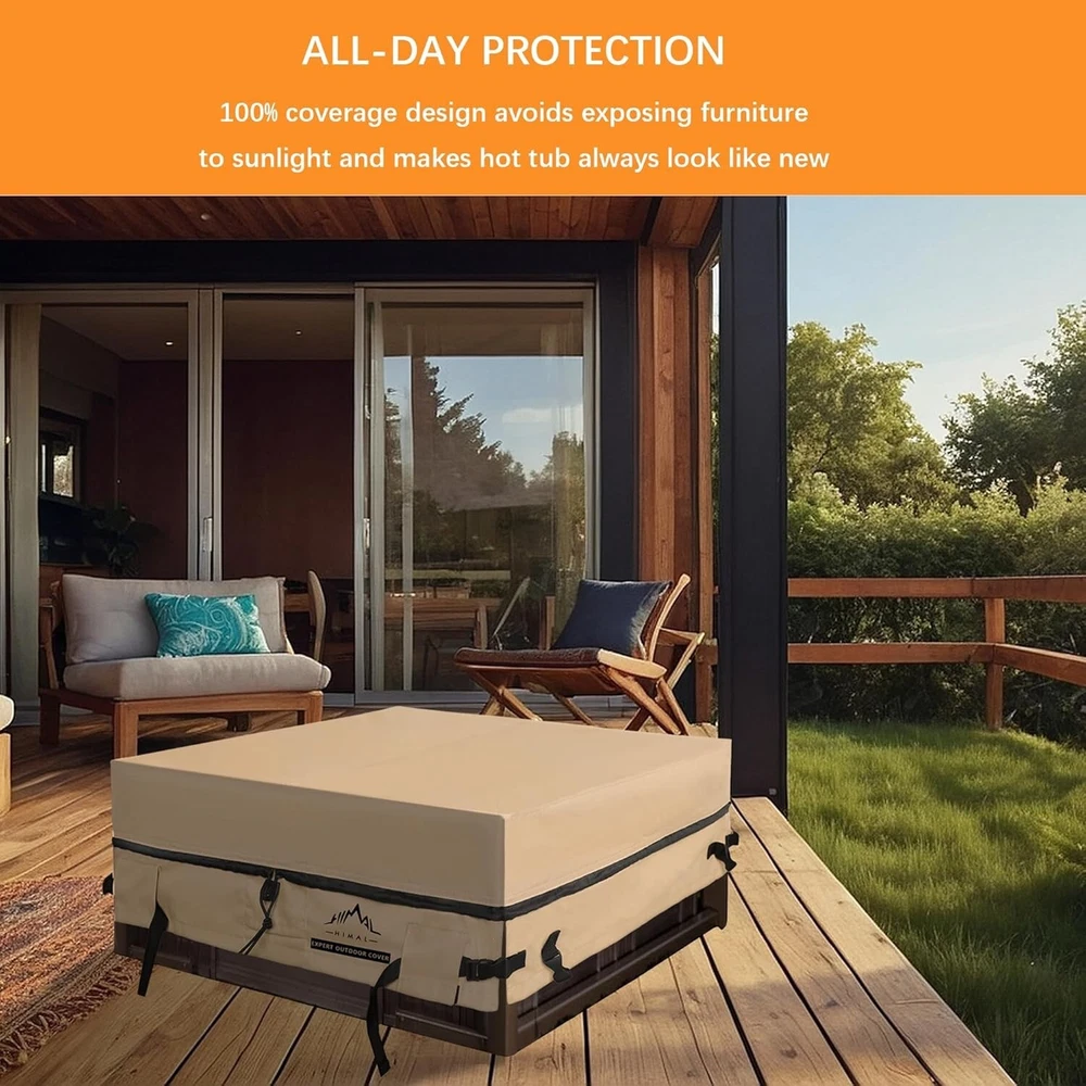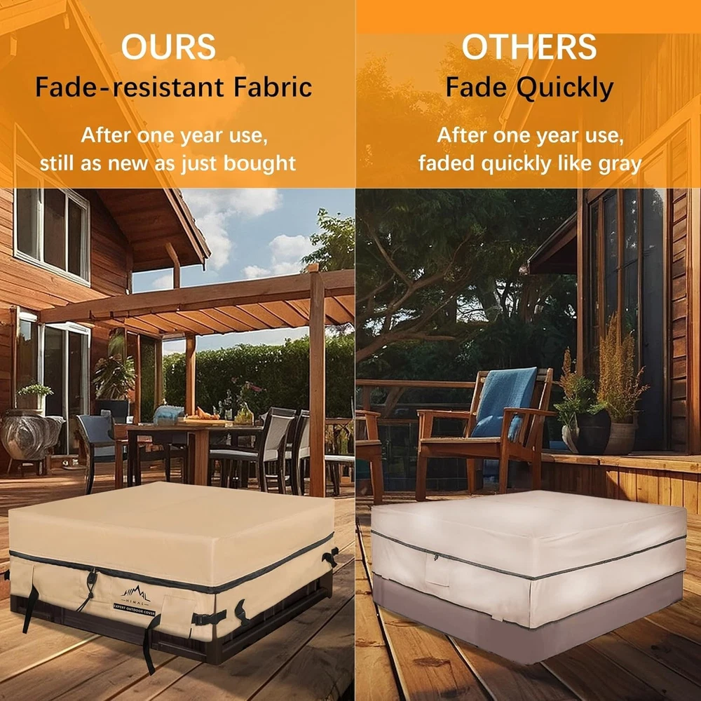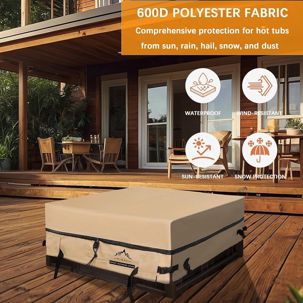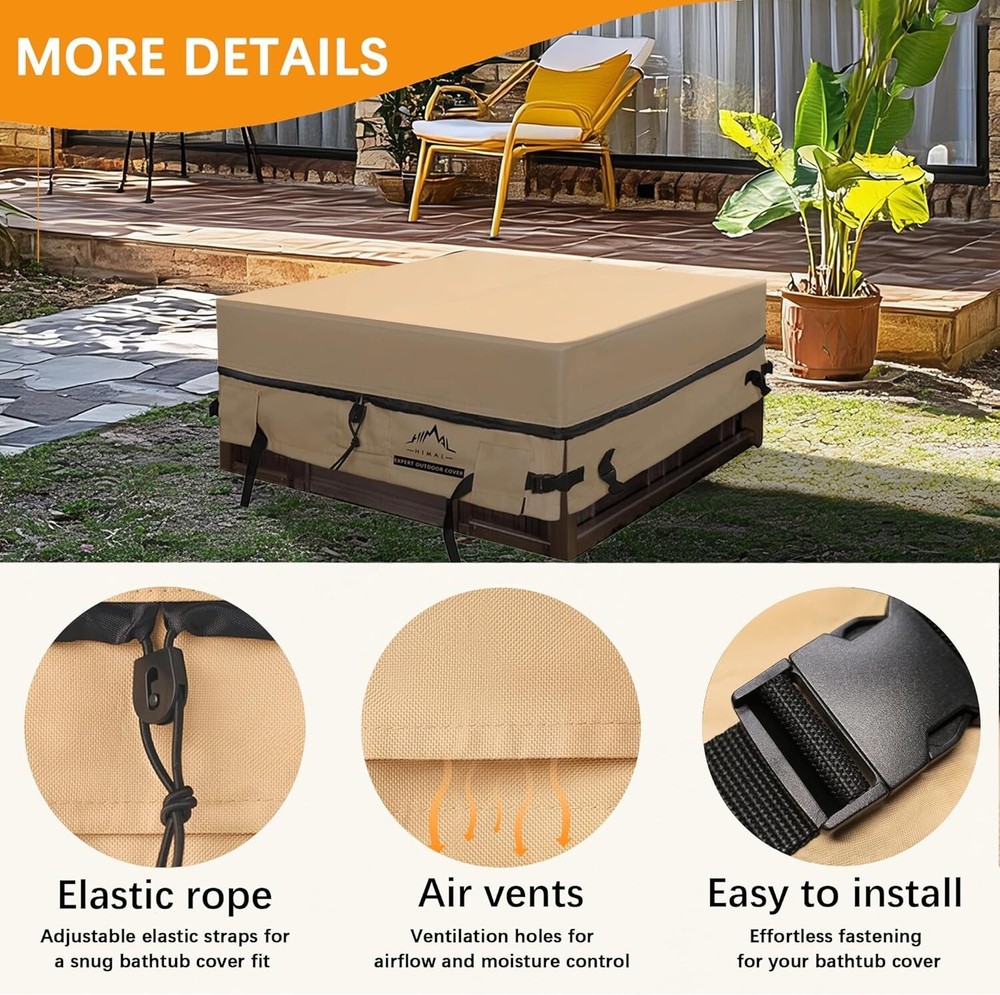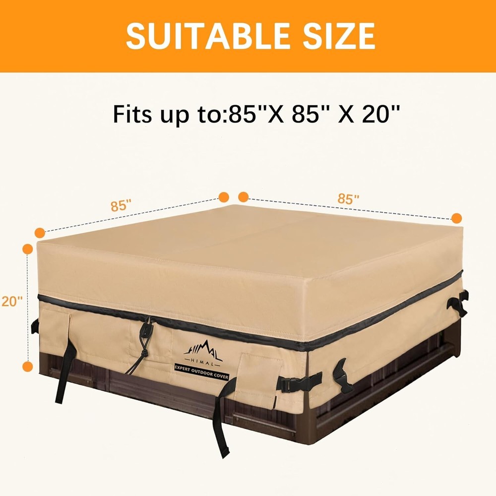 About this item 【Ultra Waterproof】 Made of 600D premium polyester fabric with excellent PU coating which can achieve 100% impervious water.Durable waterproof jacuzzi cover 【Universal Size】 Fits most square hot tubs with covers up to 85''(L) x 85''(W) x 20''(H) 【Multiple Windproof】 Elastic rope makes the cover fit the outdoor hot tub more tightly.Premium adjustable slider buckles at both sides further ensure that the SPA cover is not blown away even in high winds and severe weather 【Breathable Design】 Ideal air vents at two sides stay open to prevent your cover condensed 【Sales Service】Himal is committed to providing both pre-sales and after-sales service that makes our customers very satisfied, so please feel free to contact us if you have any questions or product quality problem