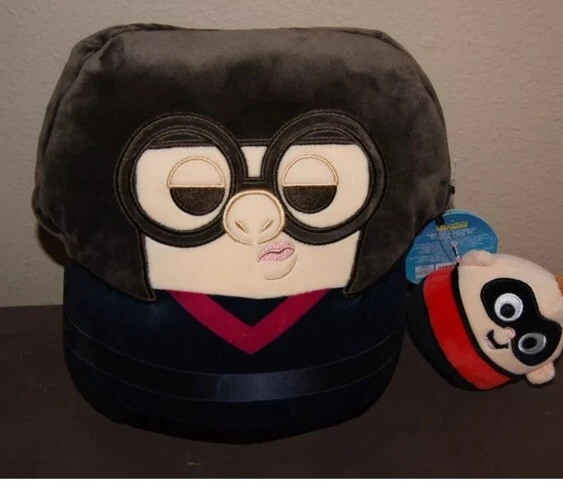 This product is a 10-inch Squishmallow featuring the character Edna from Disney Pixar's The Incredibles, with a 5-inch attached Jack Jack. It is part of the Disney franchise and was manufactured in China in 2022. The Squishmallow is brand new with tags, making it a collectible plush toy.