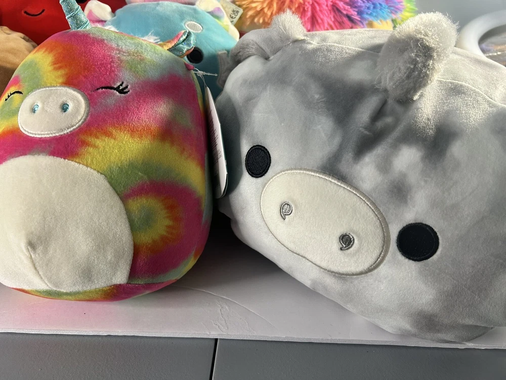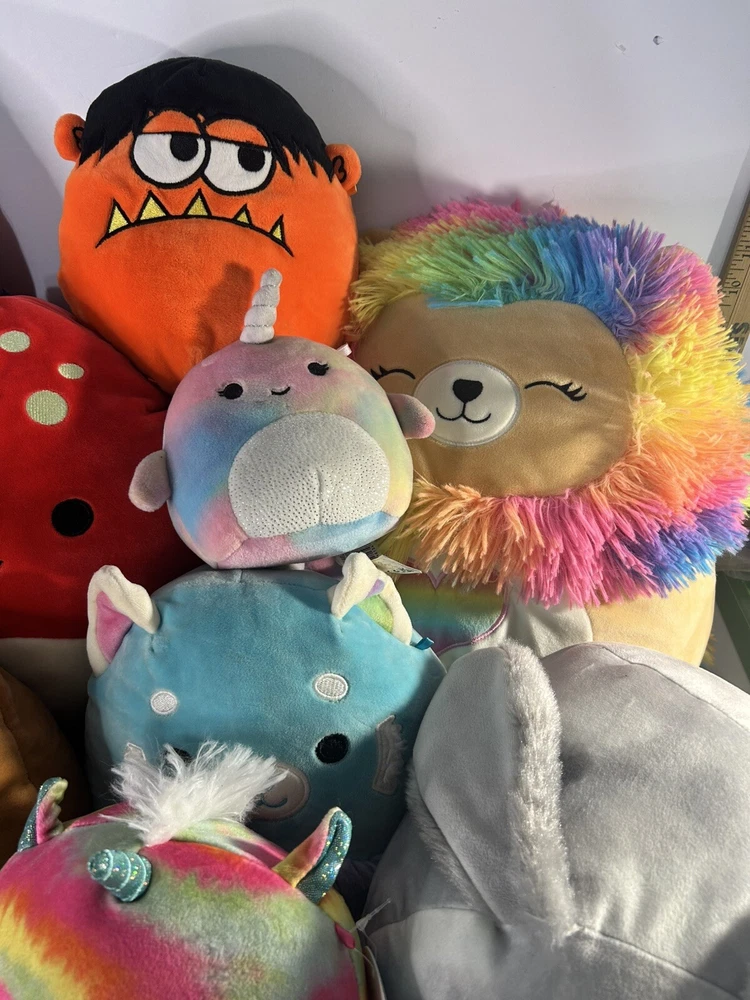The Squishmallow lot consists of various sizes of stuffed animals, including monsters, unicorns, and other collectibles.