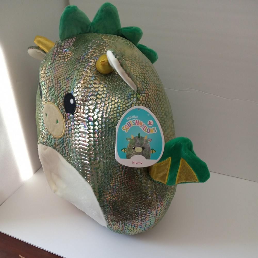 Squishmallow Marty 16"-18" Dragon Original Walgreens Exclusive 2021 NWT. This one is unique with his wings and dragon spikes down its back! His scales also turn different colors depending on the angle and lighting! Very cool, very soft squishy stuffed animal/pillow!
