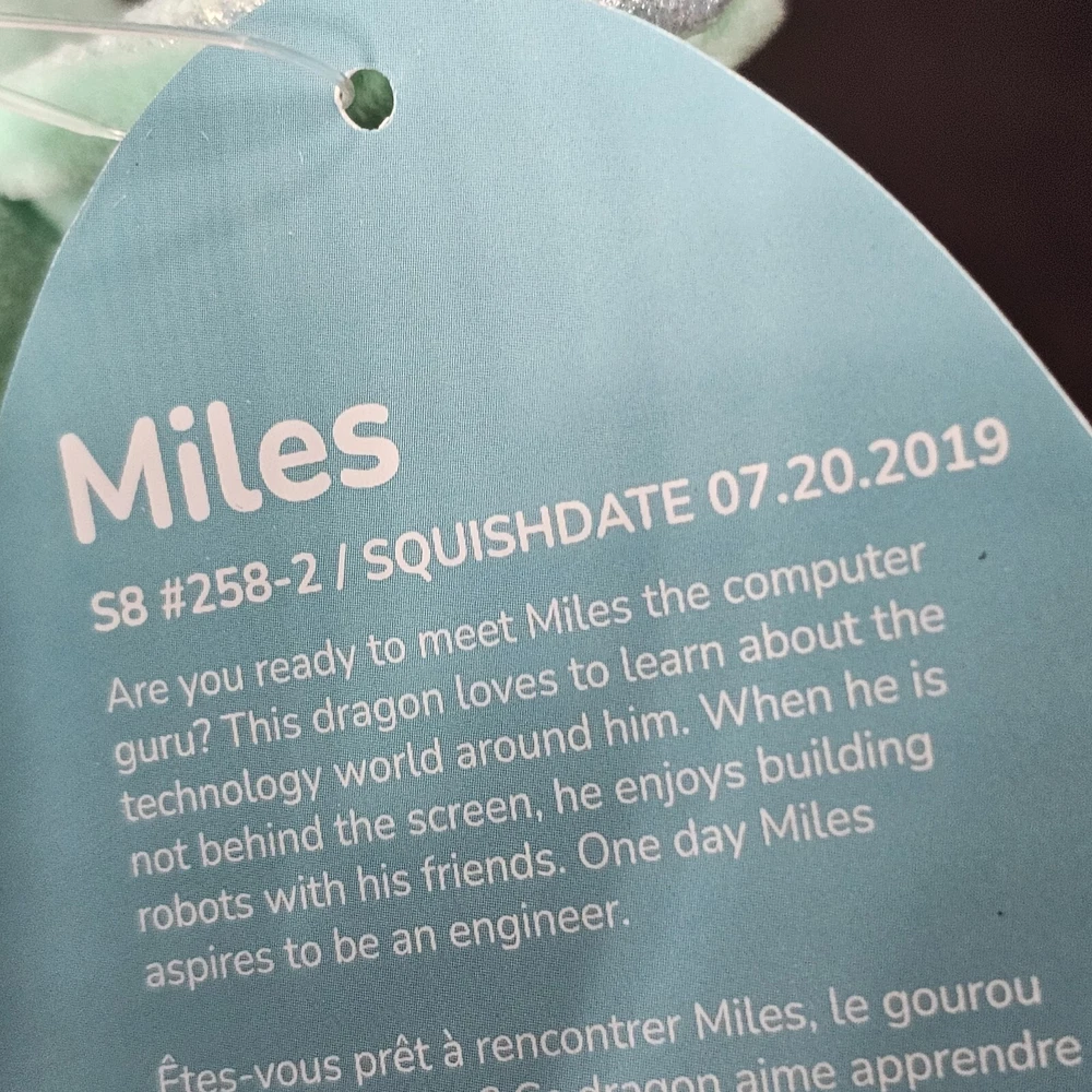 You Are Bidding On: Squishmallow Miles the Dragon 8" (NWT) Items Received: 8" Squishmallow Miles The Dragon (New With Tags) About Miles: Squishdate 07.19.2019 (#258-2) Bio: Are you ready to meet Miles the computer guru? This dragon loves to learn about the technology world around him. When he is not behind the screen, he enjoys building robots with his friends. One day Miles aspires to be an engineer. Appearance: Miles is a light teal dragon with glittery accents on nose, ears, horns, & spines. A white belly and two large black eyes. Orders carefully packaged Please message if you have questions!