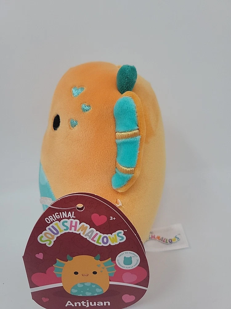 Squishmallow Plush Antjuan the Sea Monster 5 inch Hearts Valentines Day Jazwares The product is a Squishmallow plush named Antjuan the Sea Monster, measuring 5 inches. It features a Valentine's Day theme with heart decorations, made by Jazwares. The design is multicolored and part of the Squishmallow character family, perfect for collectors or as a gift for Valentine's Day in 2023.