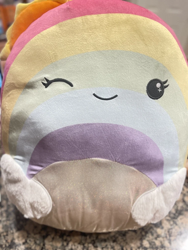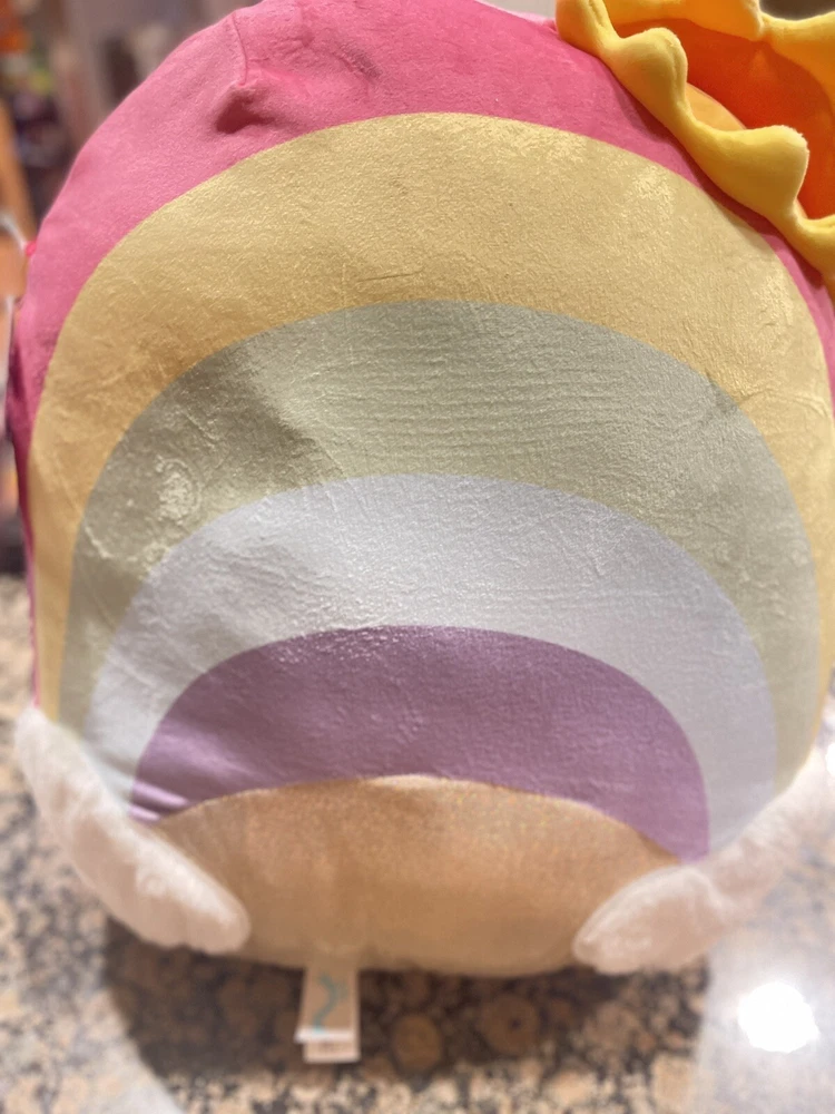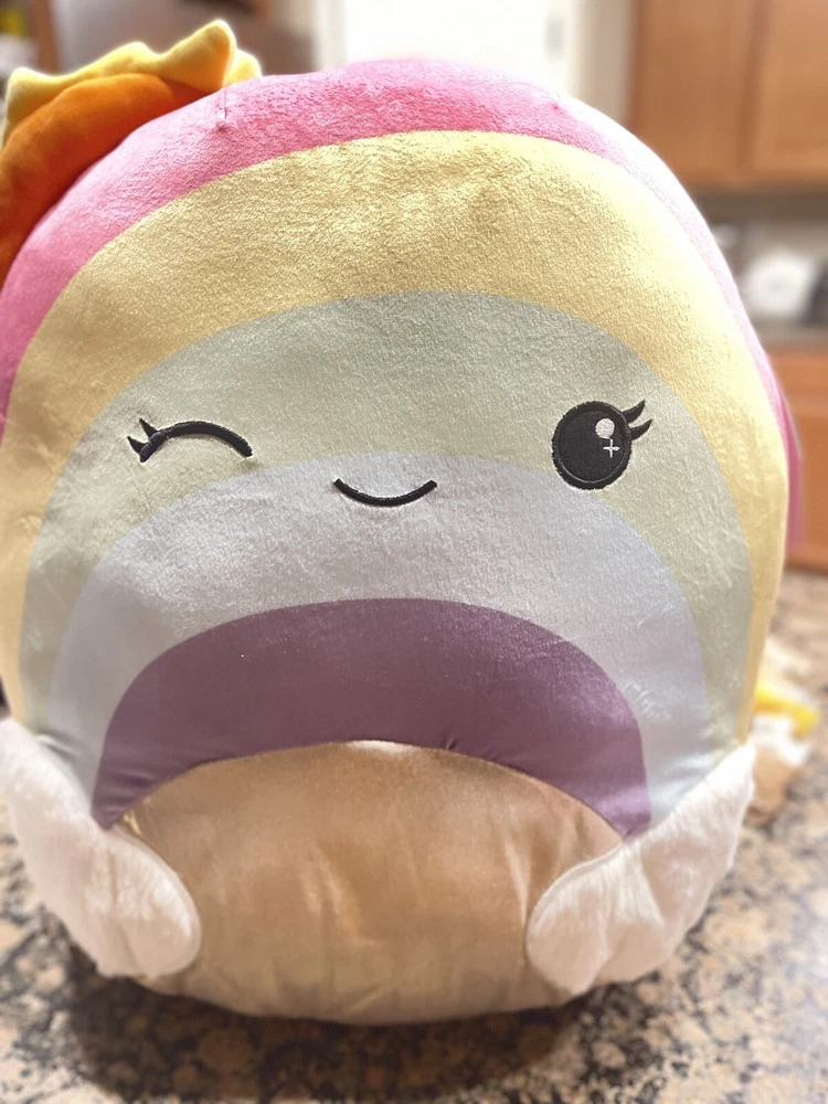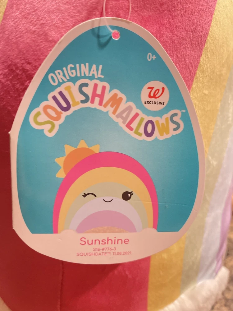 This is a Squishmallow stuffed animal toy from Kellytoy. The toy is a medium size, measuring 14-24 inches, and features a multicolor rainbow design with a sunshine character. It is a washable toy and is part of the Squishmallow character family. This particular toy is a Walgreens exclusive.