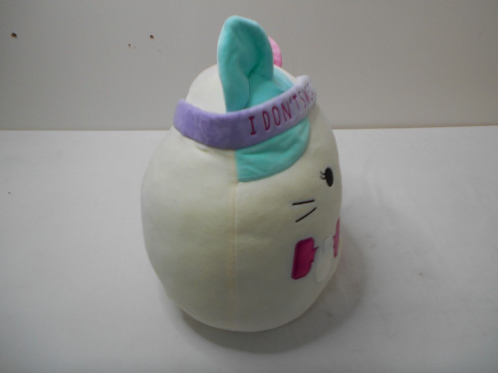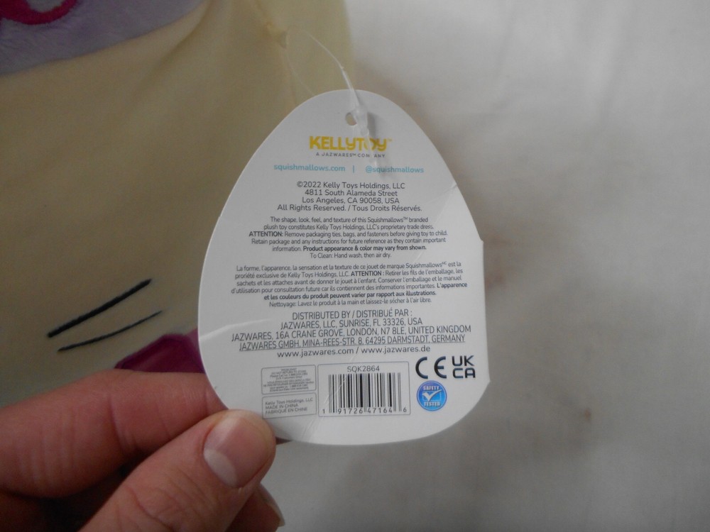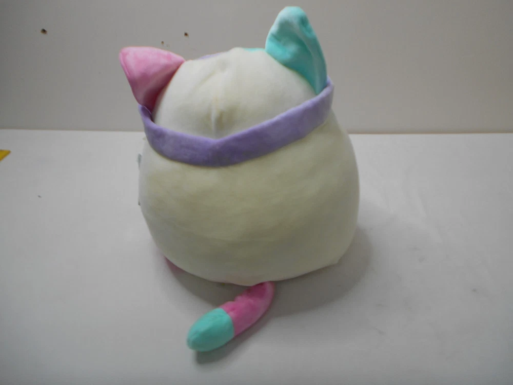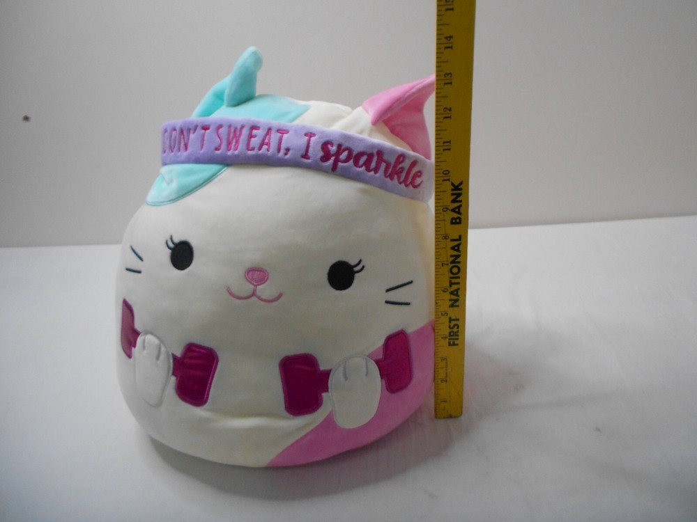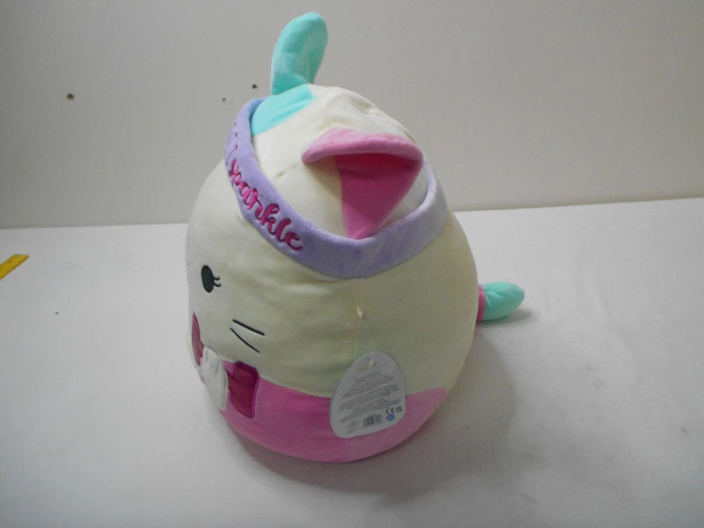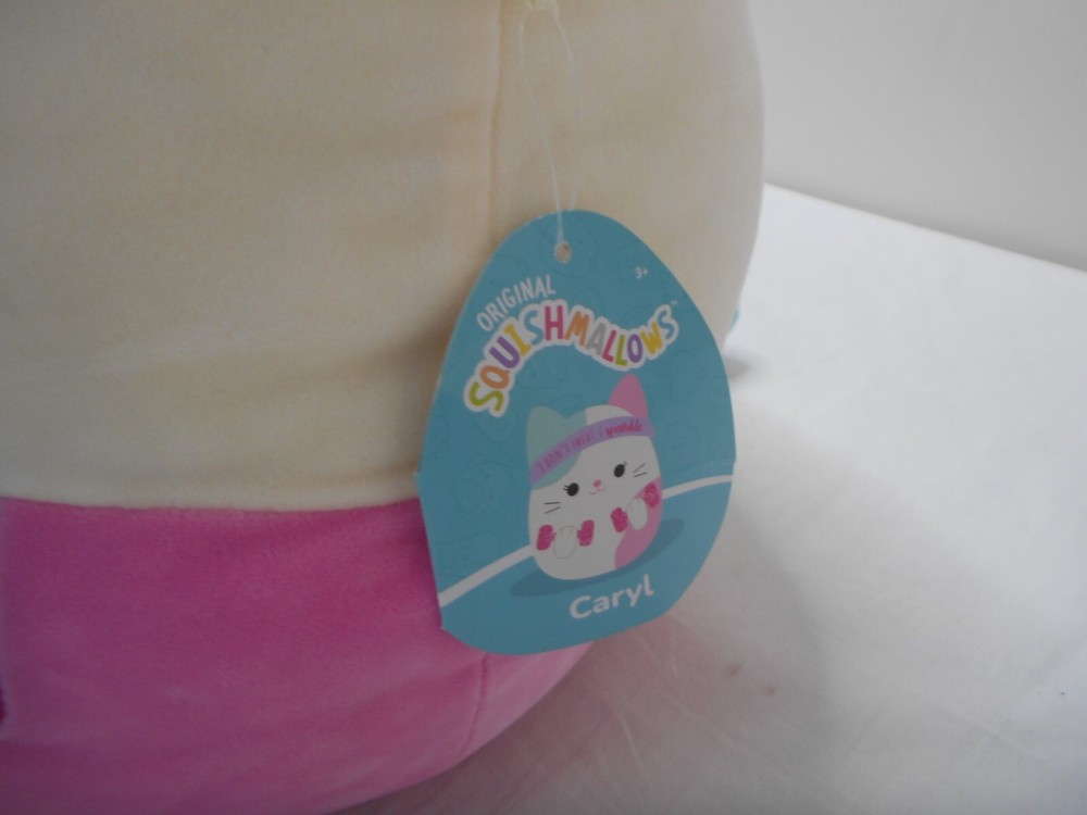 The product is a 12" Squishmallow Wellness Squad plush toy named Caryl the Cat from Kellytoy's 2022 collection. Caryl is multicolored and features the phrase "I Don't Sweat I Sparkle." This stuffed animal is part of the Character Family Squishmallow and is recommended for ages 3 and up, making it a great birthday gift for children aged 3-4 years who love medium-sized stuffed animals.
