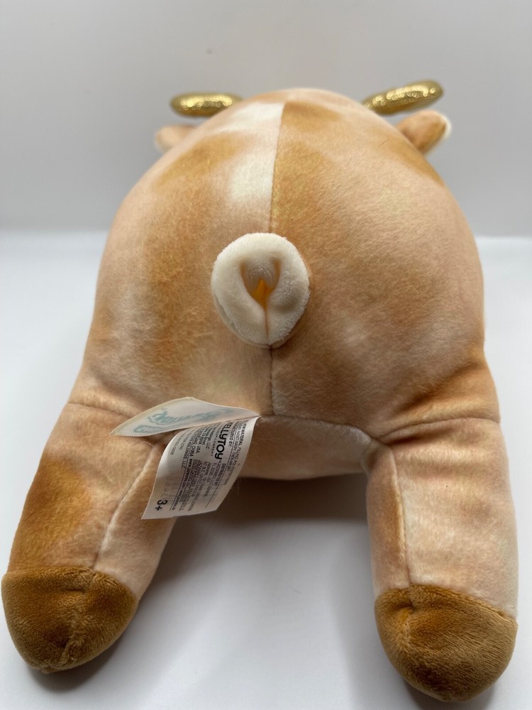 The product is a Squishmallows Hugmallow plush toy featuring Dawn the Deer, with a unique gold sparkles design. This medium-sized (14 inches) stuffed animal is part of the popular Squishmallows brand, known for their soft and huggable toys. Perfect for any occasion, this cute and cuddly deer toy is sure to bring joy to anyone who receives it.