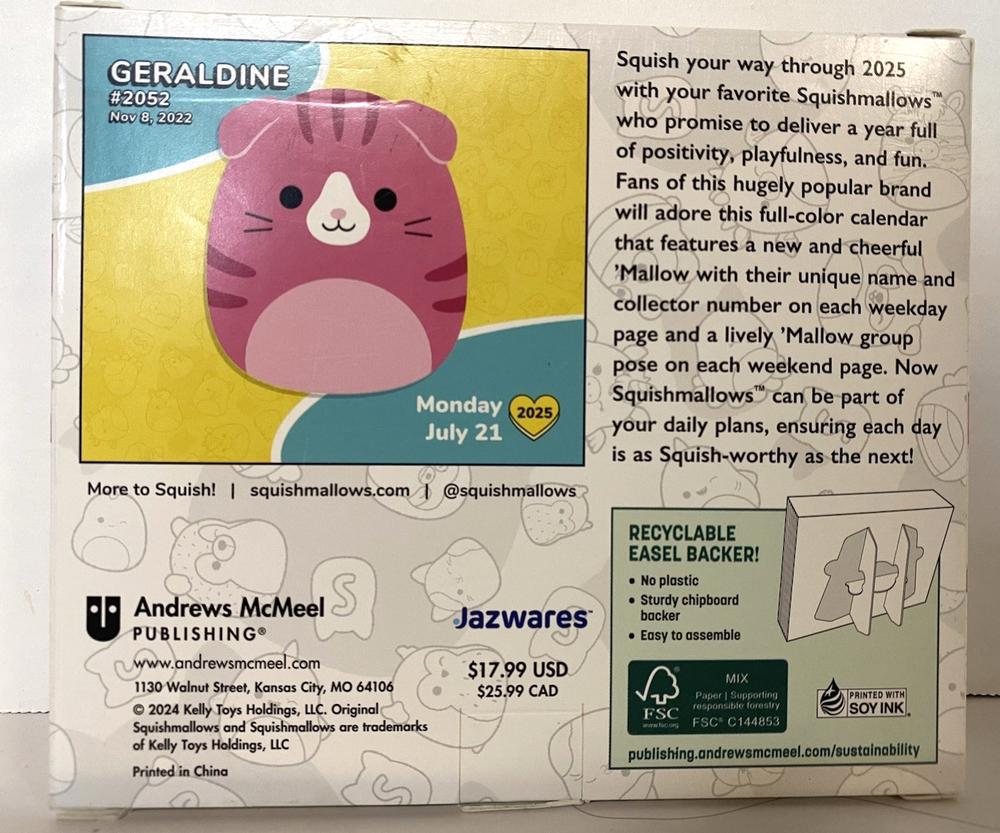Squad up and join all your favorite Squishmallows(tm) pals for a year full of positivity, playfulness, and fun. Welcome to the world of Squishmallows(tm) . . . the squishiest, friendliest, most colorful place of all! Fans of the hugely popular plush toys will love the Squishmallows(tm) 2025 Day-to-Day Calendar which features a different 'Mallow and their bio so you can learn more about your favorite Squishmallows(tm) and meet new friends. From the classic squad to the food squad, you can discover new squishy friends all year. Other features include: 5.3" x 4.4" page size No single-use plastic Recyclable chipboard easel backer for desk or tabletop display Printed on FSC certified paper with soy-based ink Full-color tear-off pages Back of pages are blank for notes or shopping lists Day/Date reference on each page Combined weekend pages Official major U.S. and Canadian holidays and observances First official Squishmallows(tm) holidays Pages feature new illustrations of Squishmallows(tm) with accompanying text