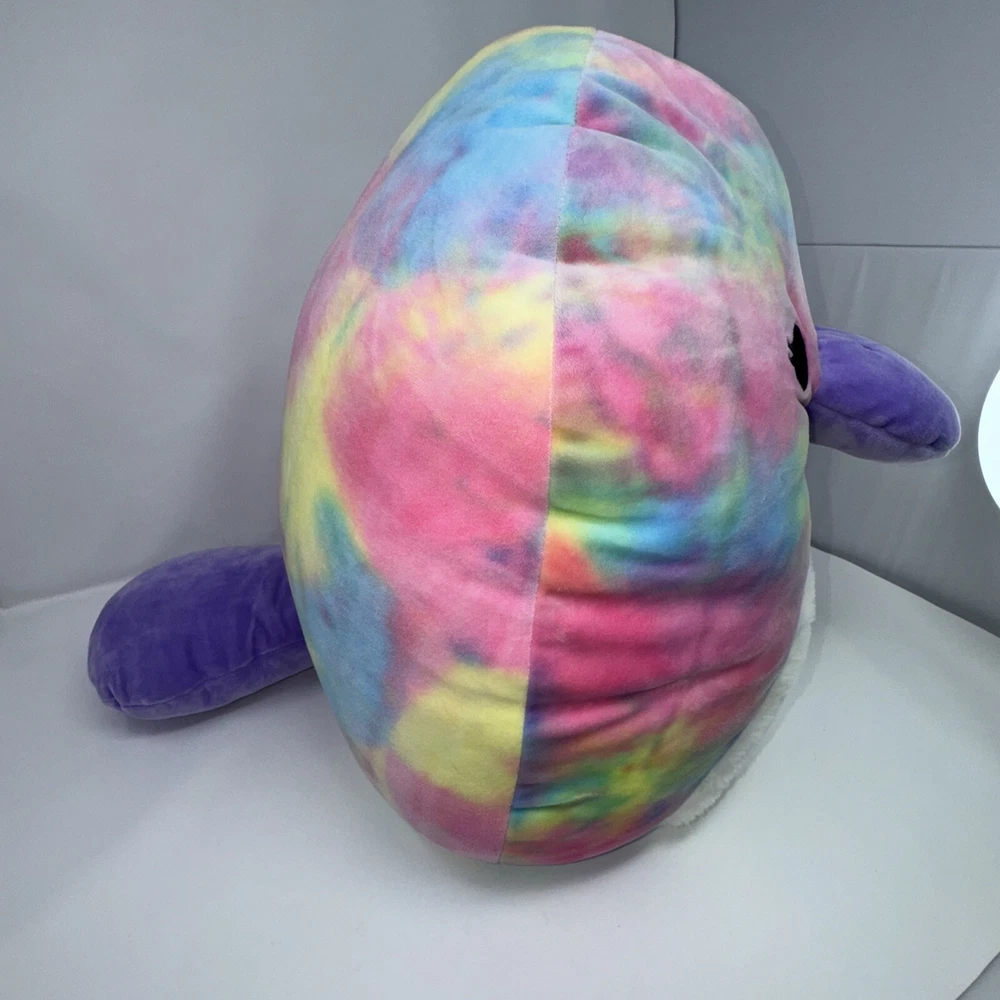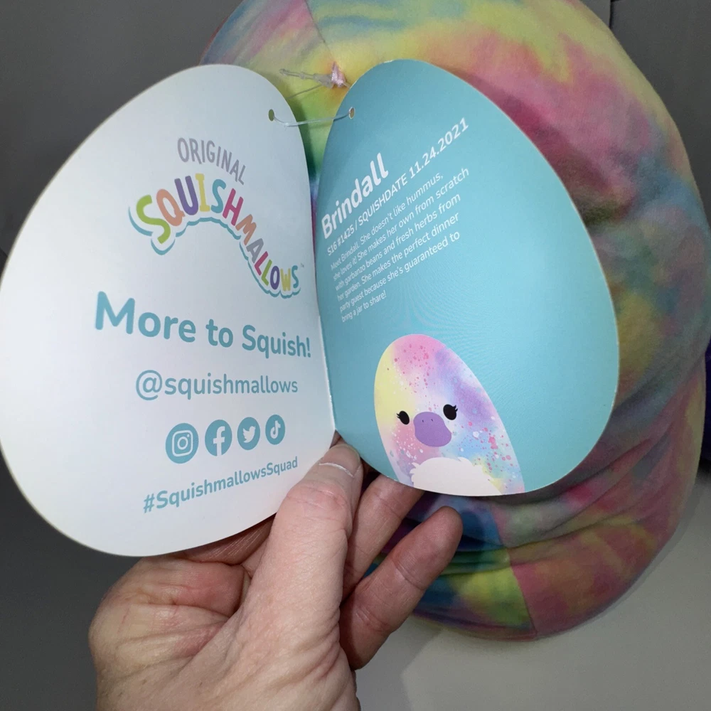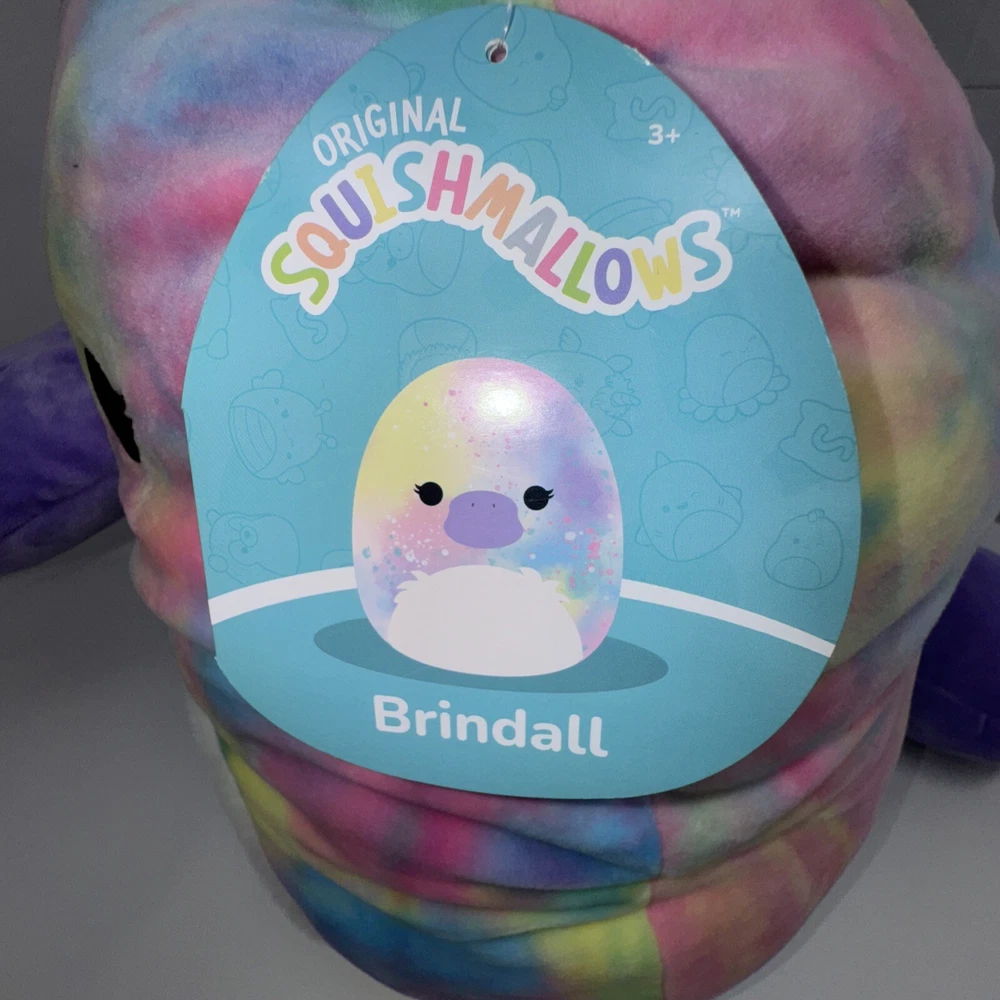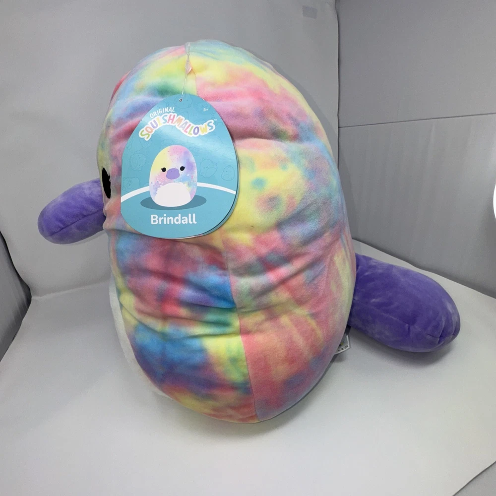 Squishmallows Brindall the Platypus Kelly toy 16" Tie Dye Plush Stuffed Animal The Squishmallows Brindall the Platypus Kelly toy is a medium-sized, plush stuffed animal measuring 16 inches. It features a multicolored tie-dye design and is washable. The toy was released in 2021 and is part of the Squishmallows brand.