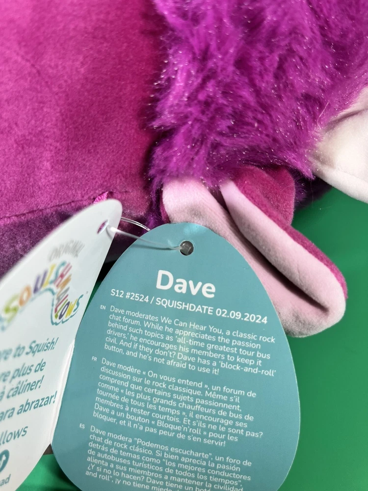 Model Name:Style 2Theme:AnimalRequired Assembly:NoColor:PurpleType:Does not applySubject Character:Dave Plum Bisongtin13:7445027176155Brand Name:SquishmallowsAre Batteries Required:NoOuter Material:PolyesterSize:Small (6-14 in)UPC:7445027176155Animal Theme:BisonYear:2024Item Dimensions L x W x H:10"L x 9"W x 12"HCollection Name:AnimalsNumber of Pieces:1Manufacturer Minimum Age (MONTHS):36.0Animal:BisonFinish Types:MatteBrand:SquishmallowsMaterial Type:PolyesterModel:SQCR06880Inner Material:PolyesterToy Figure Type:Stuffed Toy
