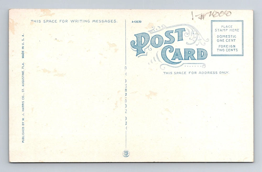 Country: USA Country/Region of Manufacture: Unknown Type: Printed (Lithograph) Size: Standard (5.5 x 3.5 in) City: St Augustine Original/Licensed Reprint: Original Era: Vintage Region: Florida Unit of Sale: Single Unit Theme: Cities & Towns Subject: Cities & Towns Material: Paper Postage Condition: Unposted