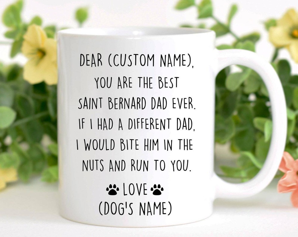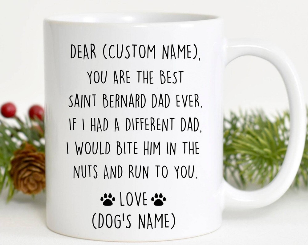 Saint Bernard Dad Birthday Gift St. Bernard Dad Christmas Gift St Bernard Dad Valentine St. Bernard Dad Appreciation St. Bernard Dad Mug Product Details.. This high quality 11oz. ceramic white mug has a premium hard coat that provides crisp and vibrant color reproduction sure to last for years. Perfect for all hot & cold beverages. The highest quality printing possible is used. It will never fade no matter how many times you wash it. Material: 100% Ceramic. Print both sides. Dishwasher and Microwave Safe. High Gloss + Premium White Finish. Printed in the U.S.A. Personalized & Custom. We support personalized and custom mug to add custom, when placing an order, you can add notes to the "order note" in shipping address section. Also you can contact us directly via message. Shipping Info. Ready to ship in 1 to 2 business days, All products are made-to-order and proudly printed in the United States. Shipped by USPS and DHL, You will receive your order in 5-7 days. Replace & Refund. All products are defective during shipping broken, chipped will be replaced free of charge. You are not satisfied with the product, we will refund 100% money to you. If any other issues arise, please do not hesitate to message, we would be more than happy to assist you.