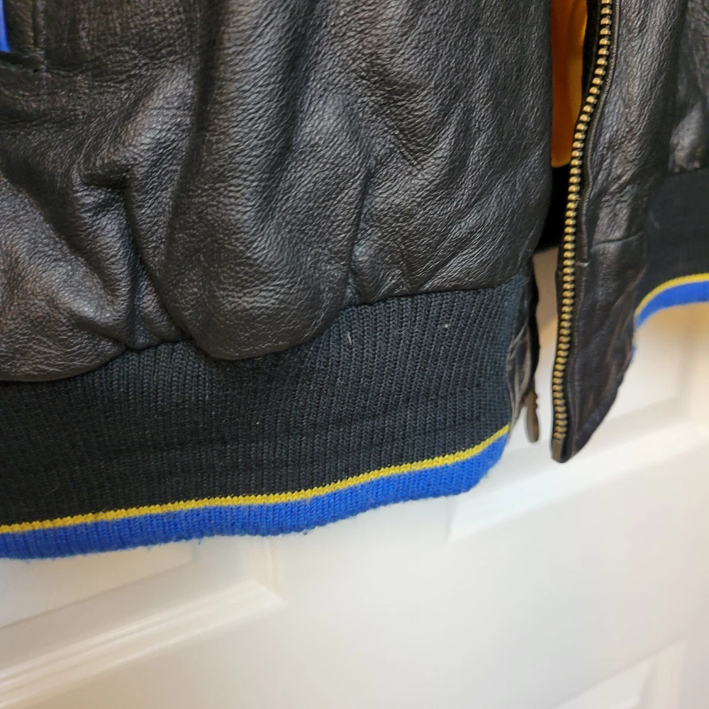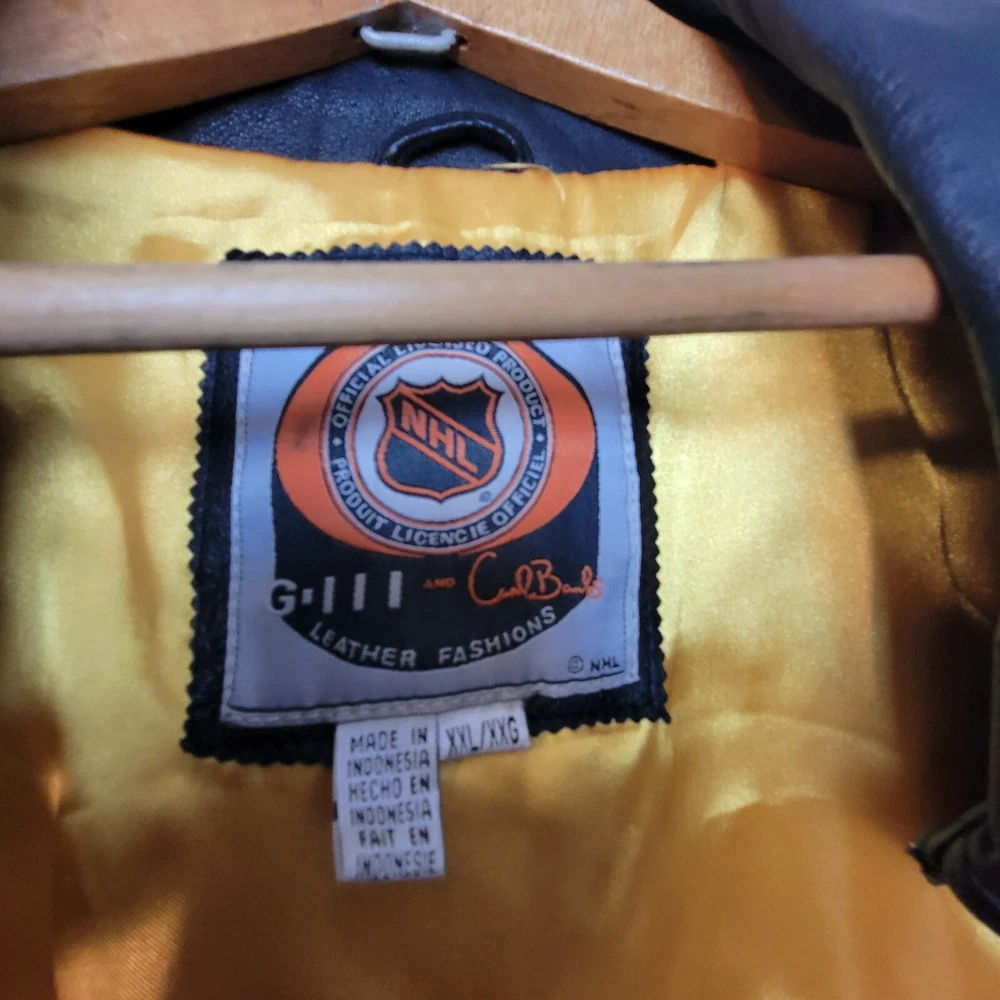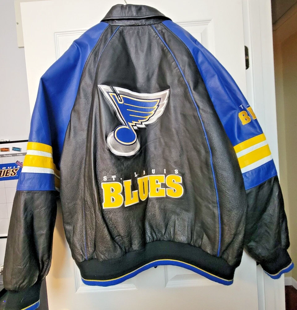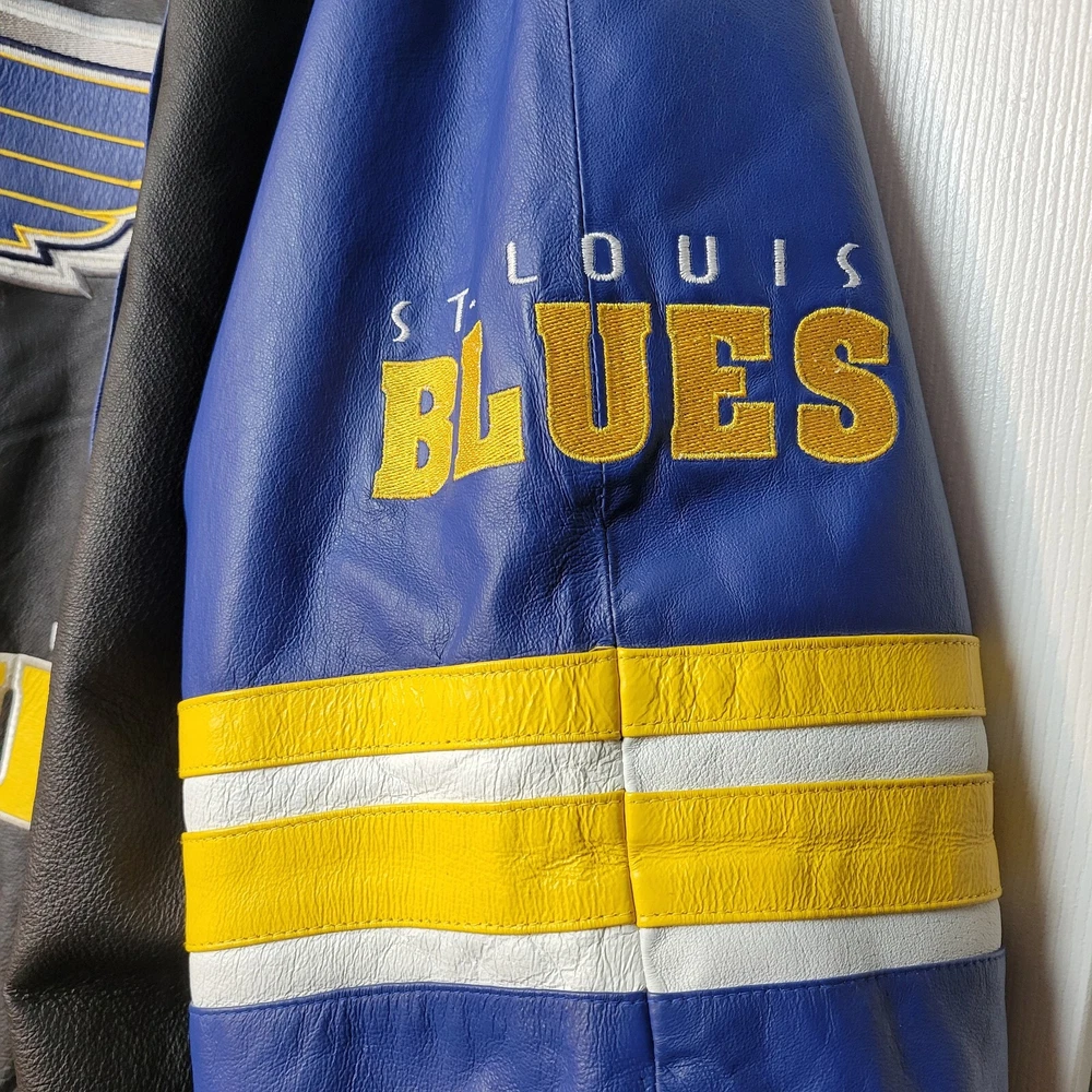 Show your love for the St. Louis Blues with this officially licensed NHL G-III Sport Carl Banks leather varsity jacket. The jacket features the team's colors of blue and gold, with the Blues logo prominently displayed on the chest. The jacket is a size 2XL and designed for men. This high-quality jacket is perfect for any Blues fan to wear to a game or around town. The jacket is made by G-III, a trusted brand in sports apparel, and is made with the finest materials for maximum comfort and durability. Get your St. Louis Blues leather varsity jacket today and show your support for the team! LOOKS NEW INGREAT SHAPE.