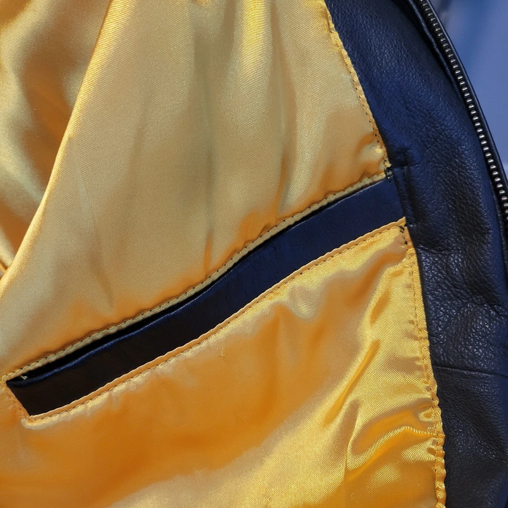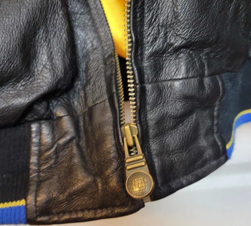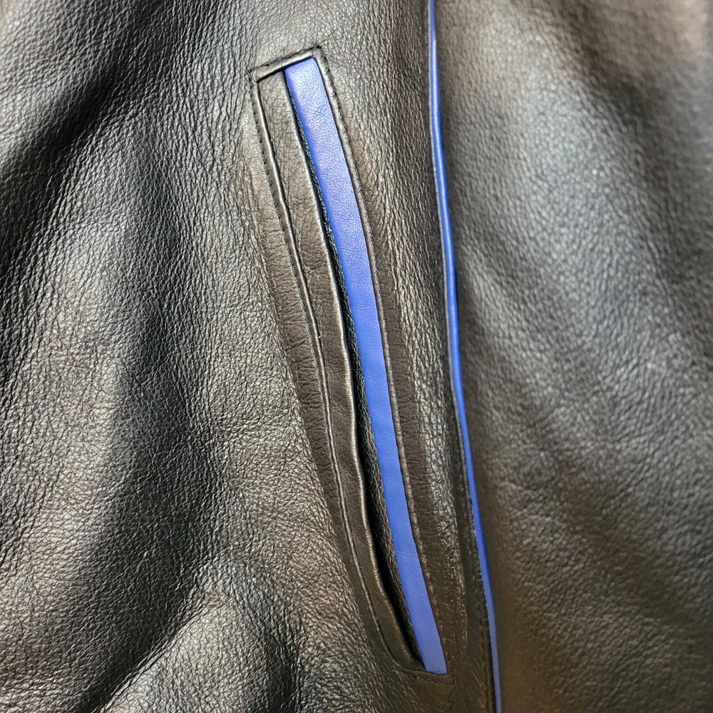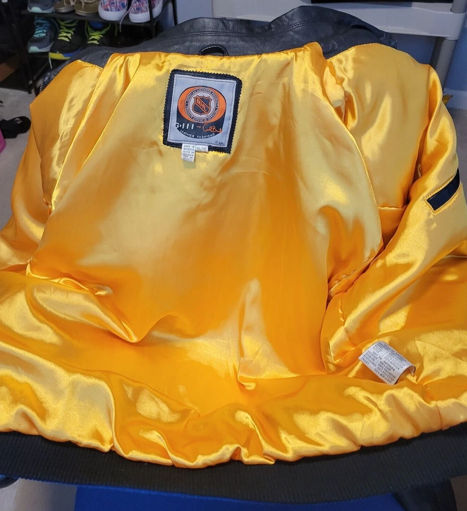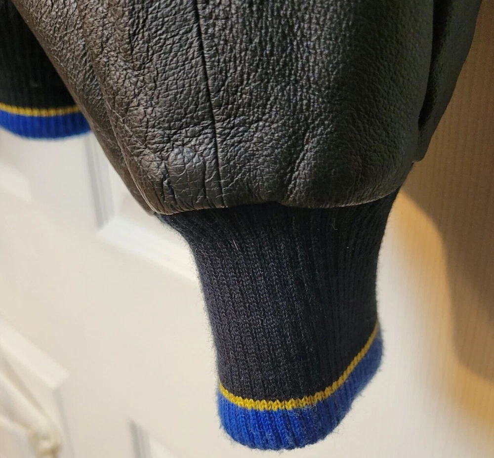 Show your love for the St. Louis Blues with this officially licensed NHL G-III Sport Carl Banks leather varsity jacket. The jacket features the team's colors of blue and gold, with the Blues logo prominently displayed on the chest. The jacket is a size 2XL and designed for men. This high-quality jacket is perfect for any Blues fan to wear to a game or around town. The jacket is made by G-III, a trusted brand in sports apparel, and is made with the finest materials for maximum comfort and durability. Get your St. Louis Blues leather varsity jacket today and show your support for the team! LOOKS NEW INGREAT SHAPE.