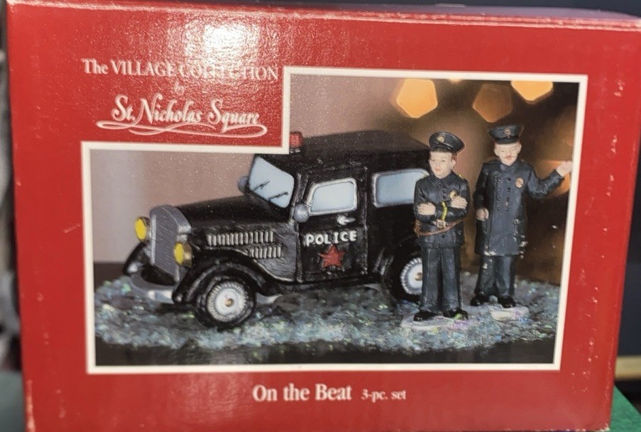 Add a festive touch to your Christmas Village with this St. Nicholas Square accessory featuring a "On The Beat" Police & Car set. The asymmetrical shaped resin set includes a police car and a police figure, perfect for creating a seasonal scene in any room. The multicolor set was manufactured in 1990 and comes in its original boxed packaging. The St. Nicholas Square Christmas Village Accessory is perfect for collectors and holiday enthusiasts of all ages. This original, boxed set is an ideal addition to any Christmas Village collection and features a police car suitable for display. Create a charming and festive scene with this unique accessory.