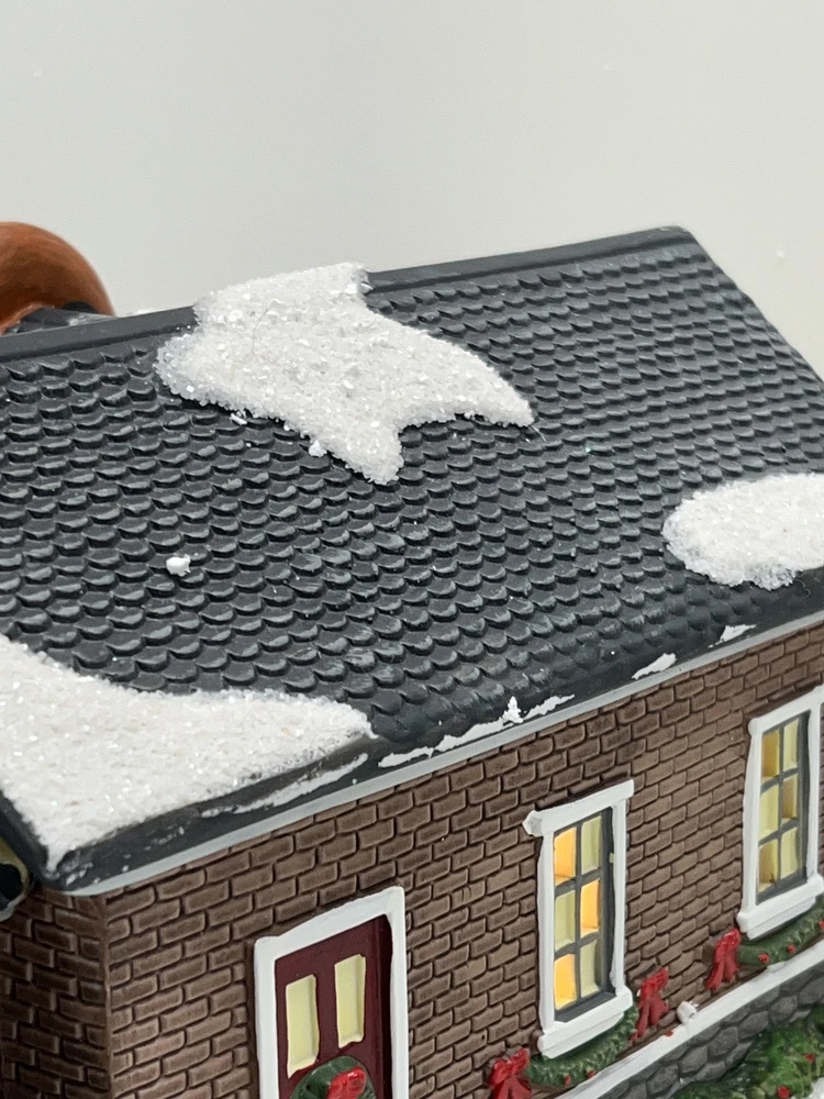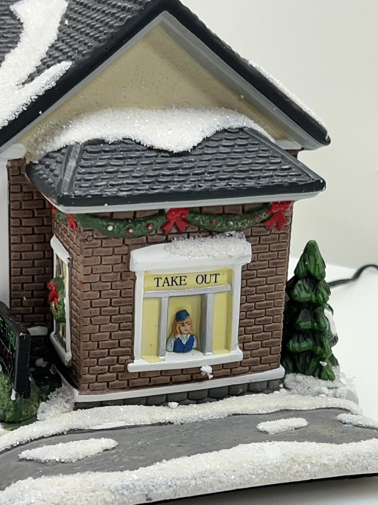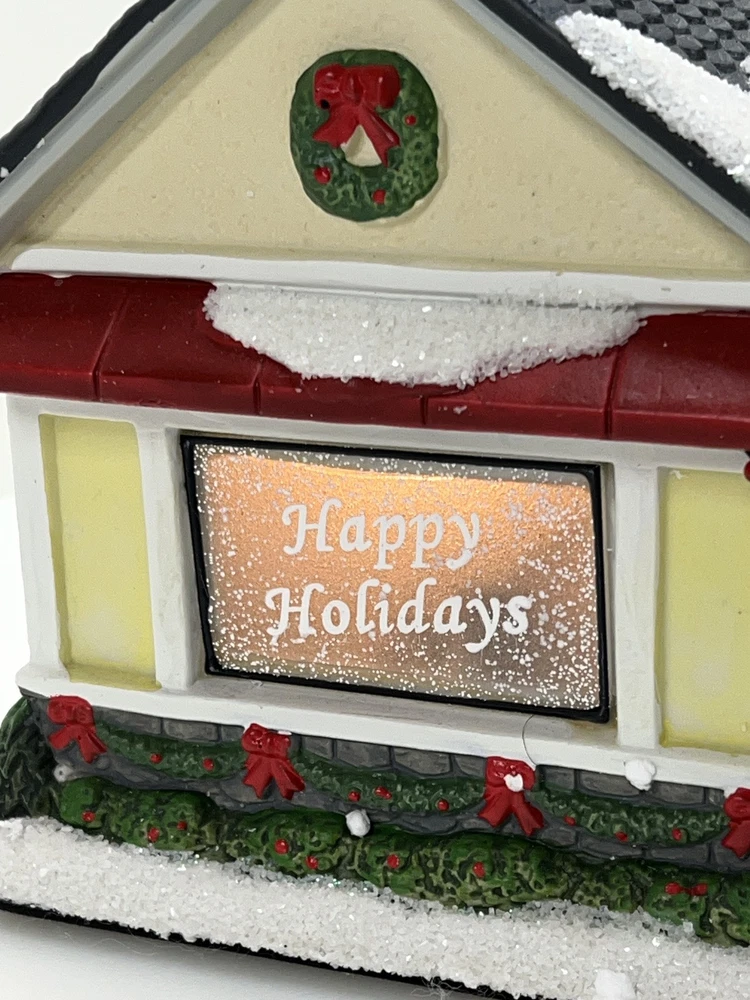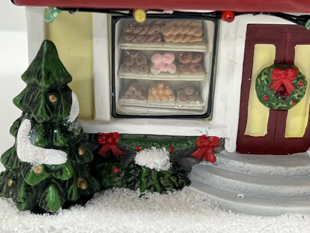 This St. Nicholas Square "The Donut Shop" Christmas village piece from 2011 is a large, asymmetrical, illuminated decoration featuring a whimsical donut shop design. It is suitable for a seasonal village display and includes LED lights with an A/C adapter. The hand-painted, American-style piece has a 3D effect and glitter accents. It is part of the St. Nicholas Square Village Collection and is designed for adults to enjoy in any room. Incredible detail and color ! Perfect pristine condition with all original packaging including light & cord and A/C Adapter