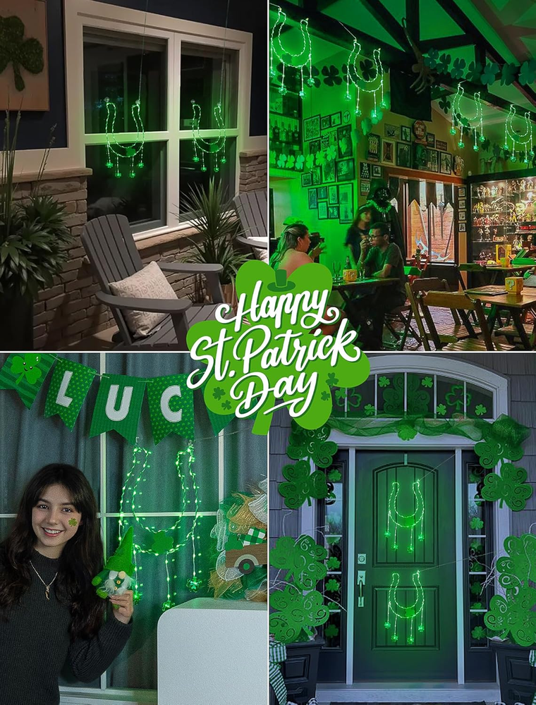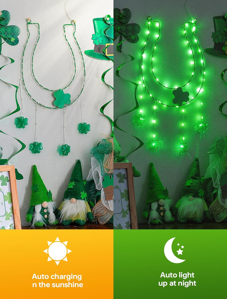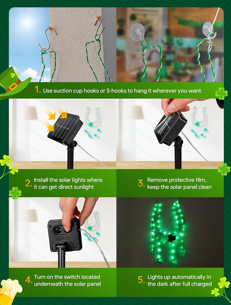 Store New Arrivals Add to Favorite View Feedback Contact Fast deliveries to the customer's home Quality customer service John Make the customers happy! St Patricks Day Solar Lights Outdoor,12In 59 LED Lighted Horseshoe Shamrock St. Patrick'S Day Decorations Window Lights,Hanging Green Light for outside Indoor Tree Yard Garden Wall Door Glass Description Unique St Patrick's Day Decoration Lights:BEEWIN 53 LED st patrick horseshoe lights is made of metal frames,tightly wrapped around with bright warm and green lights,creating eye-catching St Patrick's Day decorations for your home Solar-powered st patricks day lights outdoor:Built-in light sensor,auto on at dusk and auto off by day.Energy saving,no electricity bills,no cords or sockets 8 Modes:Switch the lighting modes of the green decor lights by pressing the button on the solar panel,Combination,In Wave,Sequential,Steady On,Chasing/Flash,Slow Fade,Twinkle/Flash and Steady On,meet different occasions Easy to Install:The horseshoe hanging light comes with extra S hooks,suction cup hooks,and the 6.6ft long lead allows the green lights for st patrick's day to hang directly wherever you want,easy and quick to decorate indoor and outdoor Wide Applications:Horseshoe shamrock st. patrick's day decorations window lights perfect for decorating wall,garden,yard,balcony,tree,terrace,gazebo,porch,also ideal St Patricks Day gifts for your relatives and friend Product Description 1 8 MODES 2 2 WAYS TO HANG 3 WATERPROOF Indoor Decoration Balcony Decoration Window Decoration Style Garden Number of Light Sources 59 Number of Items 1 Power Source Solar Powered Color Green Light Color Green Material Metal Type of Bulb LED Batteries Required? Yes Package Dimensions 12.99 x 10.16 x 1.14 inches Item Weight 11.7 ounces Theme st. patrick's day Batteries Included? Yes Voltage 3 Volts Recommended Uses For Product shamrock lights outdoor for garden,yard,window,wall,St. Patrick's Day,spring,balcony,porch,gazebo,glass,front door,tree,terrace,ceiling,parties Special Features Corded Included Components Metal,Fairy lights,Hooks Size Horseshoe ABOUT US We offer the best prices around on high quality products. Our E-store includes media such as books, movies, music and games while offering electronics, toys, sporting apparel, clothing, tools, general home, garden items and more. SHIPPING We are always working hard to ensure your package arrives as soon as possible. Please understand that some factors like weather, high postal traffic, and the performance of shipping companies are outside of our control. We offer free shipping to the lower 48 states and ship within 2 business days of payment, usually sooner. We do not accept P.O. Boxes. Please provide a physical address. For shipping outside of the continental USA, we only use eBay's Global Shipping Program. The item is shipped to KY and then sent to the rest of the world. International customers are responsible for all duties and taxes. Continue to 'check out' to calculate costs for shipping the item to your country. Messages regarding eBay's Global Shipping Program MUST be directed at eBay EXCLUSIVELY. RETURNS We offer a 30-Day Return Policy on items in which you are not completely satisfied with. You have the option of a full-refund or an exchange of the item. No returns are available on items shipped outside of the USA PAYMENT We accept PayPal. CONTACT US This page content is yet to come Please ad us to your favorite seller and visit again later Thank You CUSTOMER SATISFACTION We try our very best to make sure every customer is completely satisfied. If there's a problem, message us! We're happy to help. WE ACCEPT