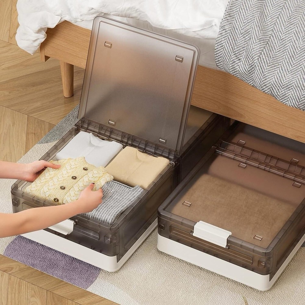 Color transparent Material Polypropylene Special Feature Wheels, Folding, Stackable, Transparent,Dustproof,Double hinged cover Style , Retro Recommended Uses For Product under bed storage Sturdy reinforced plastic construction ensures durability and strength; Superior to other under bed bins Dustproof double-hinged transparent lid allows easy access from both sides; Clear plastic lets you see contents Foldable design assembles in seconds without tools; Collapses flat for compact storage when not in use Built-in wheels and grooved lid allow boxes to roll and stack together; Great for maximizing under-bed space Increase storage in dorms, bedrooms, and other tight spaces; Ideal for clothing, bedding, crafts, books, shoes