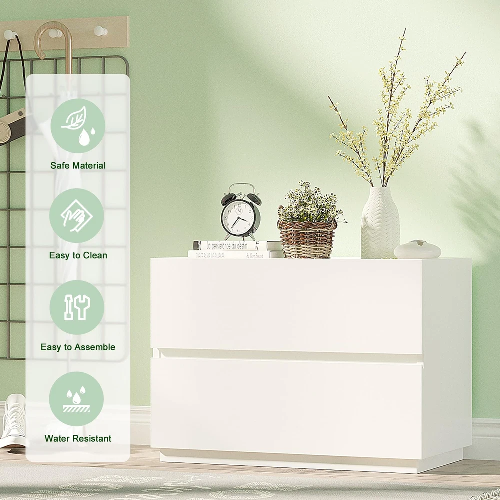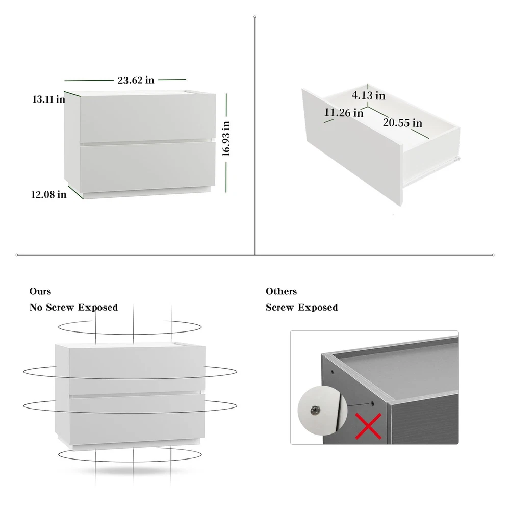 Drawer Units are designed for multi-use. Simple and neat looking with two drawers. You may use it as bedside nightstand, file cabinet or storage cabinet for living room, bedroom or entryway. Versatile and stylish, our two-drawer units are perfect for any room. Use them as closet drawers, nightstands, file cabinets, or storage cabinets in your bedroom, living room, or entryway. Creative Design: Our stackable drawer units feature a clever top and bottom design for easy stacking. You can stack one unit onto another to create your own unique combination. Available in various colors, you can create dozens of different combinations to suit your needs. Use them as end tables, nightstands, file cabinets, dressers, or even TV cabinets. Our drawer unit boasts a sleek and polished appearance, with every detail meticulously designed for a neat finish. The drawers hide all screws and holes, while each panel is expertly finished and fully sealed. Our drawer unit is made of high-quality engineered wood that conforms to TSCA Title VI standards for eco-friendliness. Our drawer unit measures 23.62W 13.11D 16.93H inches, making it a compact and versatile storage solution. With heavy-duty drawer slides, the unit can accommodate larger loads and has a longer service life.
