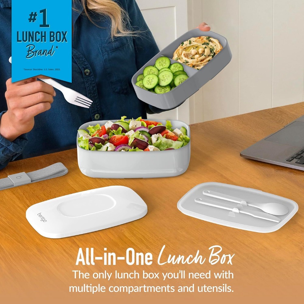 All-in-One Convenience: Forget packing multiple containers or searching for utensils! This bento box includes a built-in utensil set, three separate compartments, and a durable nylon strap, all securely held together for quick, hassle-free meals on the go. Premium, Stylish Design: Crafted from high-quality, food-safe materials, this sleek, minimalist lunch box is available in modern hues. It combines style with eco-friendly functionality, reducing single-use plastics while offering a convenient alternative to traditional lunch boxes. Compact & Space-Saving Storage: The top container nests inside the bottom for easy, efficient storage, making it perfect for compact spaces. Whether at home or on the go, it stores easily and takes up minimal room in your bag, backpack, or kitchen. Durable & Lightweight: Built for everyday use, this stackable lunch box is both durable and lightweight, making it easy to carry in your bag or backpack. Whether you're heading to work, the gym, or traveling, it provides convenience without adding extra bulk or weight. Microwave & Dishwasher Safe: The main containers are microwave- and dishwasher-safe (excluding the lid, divider, and strap), offering hassle-free heating and cleaning. Ideal for meal prep, snacks, or lunch, the stackable compartments and removable tray divider allow you to customize portions.