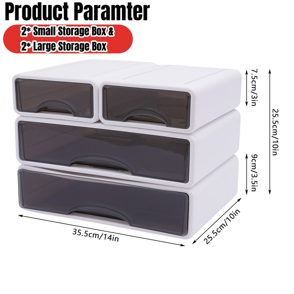 Stackable Storage Box With 4*Drawer Desk Organizer Storage Container Neat Large Welcom to alwaytty03 Product Parameters: Material: PP Color: White Mounting Type: Tabletop Mount Special Feature: Stackable Shape: Rectangular Small Storage Box Size: 25*17*7.5cm/9.8*6.7*3in Large Storage Box Size: 35.5*25.5*9cm/14*10*3.5in Total Height(Stackable): 25.5cm/ 10in Product Size: 35*26*27cm/13.8*10.2*10.6in Net Weight: 2kg/4.41lbs Gross Weight: 2.11kg/4.65lbs Package Includes: 2* Small Storage Box 2* Large Storage Box Product Features: High-quality Material: The product is made of high-quality MDF and the surface is painted, with high hardness, strong pressure resistance, and anti-corrosion performance. Fashionable Appearance: Its simple lines and a classic color scheme can be used as a home decoration to add atmosphere and beauty. It can also be used to display your decorations such as vases, green plants, and books. High Stability: The thickened panels and 4 outward extending wooden feet provide the product with great stability and give it a strong weight-bearing capacity (44.09~66.14lbs). Storage Assistant: Double drawers and a wide countertop (39.3*18.9 inches) can increase your storage space so that you can store items in an organized manner. Thoughtful Design: The 16.5inch coffee table height can adjust to most sofa heights. 13.78inches floor height and open bottom allow you to sit comfortably on the floor and extend your legs without restriction. Easy to Carry and Clean: The small size (39.3*18.9*16.5 in) makes it easy to carry out and store, and it is ideal for dormitories, small apartments, and other rooms where the space is tight. And its simple structure and smooth surface of the product make it easy to clean. Easy to Install: Simple product structure, complete installation parts, and a detailed electronic English instruction allow you to install more easily and accurately. Note: Please allow the slight color difference caused by the shooting light and 1-3cm error due to manual measurement and make sure you do not mind before ordering. Details Bottom Wear Resistance: The bottom is designed with a recess that fits into the top card slot while increasing wear resistance. Curved Handle: The curved handle allows you to push and pull the drawer more smoothly, and its edges are finely polished so that they won't hurt. Payment Delivery details Terms of sales About us Contact us Payment We accept ebay payment 。 Fees such as import duties, taxes are not included in the item price or shipping costs. These charges are the buyer's responsibility. Delivery details Shipping: 2-9 working days to: USA Terms of sales We maintain high standards of excellence and strive for hundred percent customer satisfaction. Feedback is very important to us. We hope that you contact us immediately before you give neutral or negative feedback, so that we can address your concerns. It is impossible to address issues if we do not know about them! About us Your satis faction is our ultimate goal. We work hard to earn your trust and future business. Our certified technicians have tested each item before shipping. The unit comes with 1 year limited warranty on all manufacturing defects. a) If you receive a defective item, you may return it or ask for a discount. Please contact us within 14 days after you receive the package. b) What you returned must be intact and in its original packaging as re? u. Customer is responsible for shipping costs of the returned item. c) We will cover the cost of shipping back t with the shipping rate indicated in the registration page. We will send you a new unit or refund the full payment you paid. Thank you. Contact us Business Hour Business Hour: Monday To Friday: 8:30 AM to 5:00 PM (Beijing China time) Due to time zones, our reply to your questions may not be immediately. But within above working time, we will reply your email within 24 hours. If it's non-workdays, please kindly be patient and wait till Monday. Please contact us with ebay message. Please feel free to contact us if you have any questions. Monday To Friday: 8:30 AM to 5:00 PM (Beijing China time) Due to time zones, our reply to your questions may not be immediately. But within above working time, we will reply your email within 24 hours. If it's non-workdays, please kindly be patient and wait till Monday. Please contact us with ebay message. Please feel free to contact us if you have any questions. Brand TOOL1SHOoo Features ★Nice and Practical, High Quality Packaging★ Feature ❤Great value with warranty❤ Custom Bundle No Warranty Three years Highlights Nice and Practical, High Quality Packaging, High quality W/ warranty!, Easy installation,Convenient Use,Easy Operation Feature * Great Durability,Convenient Use Year of manufacture 2023 Surface Finish Made of high quality material Manufacturer Warranty 3 Years Material PP Shape Rectangular Style Simple Color White Number of Drawers 4 Type Stackable Office Storage Box Mounting Tabletop Mount Small Storage Box Size 25*17*7.5cm/9.8*6.7*3in Large Storage Box Size 35.5*25.5*9cm/14*10*3.5in Item Height 25.5cm/ 10in (total) Package Size 35*26*27cm/13.8*10.2*10.6in Net Weight 2kg/4.41lbs Gross Weight 2.11kg/4.65lbs Item Length 35.5cm/14in Item Width 25.5cm/10in UPC Does not apply MPN Does not apply
