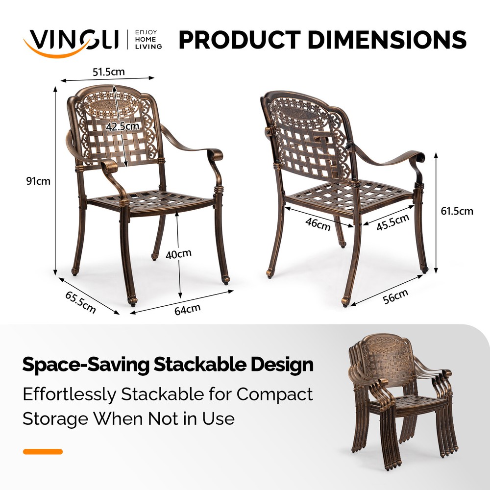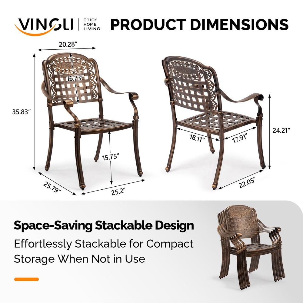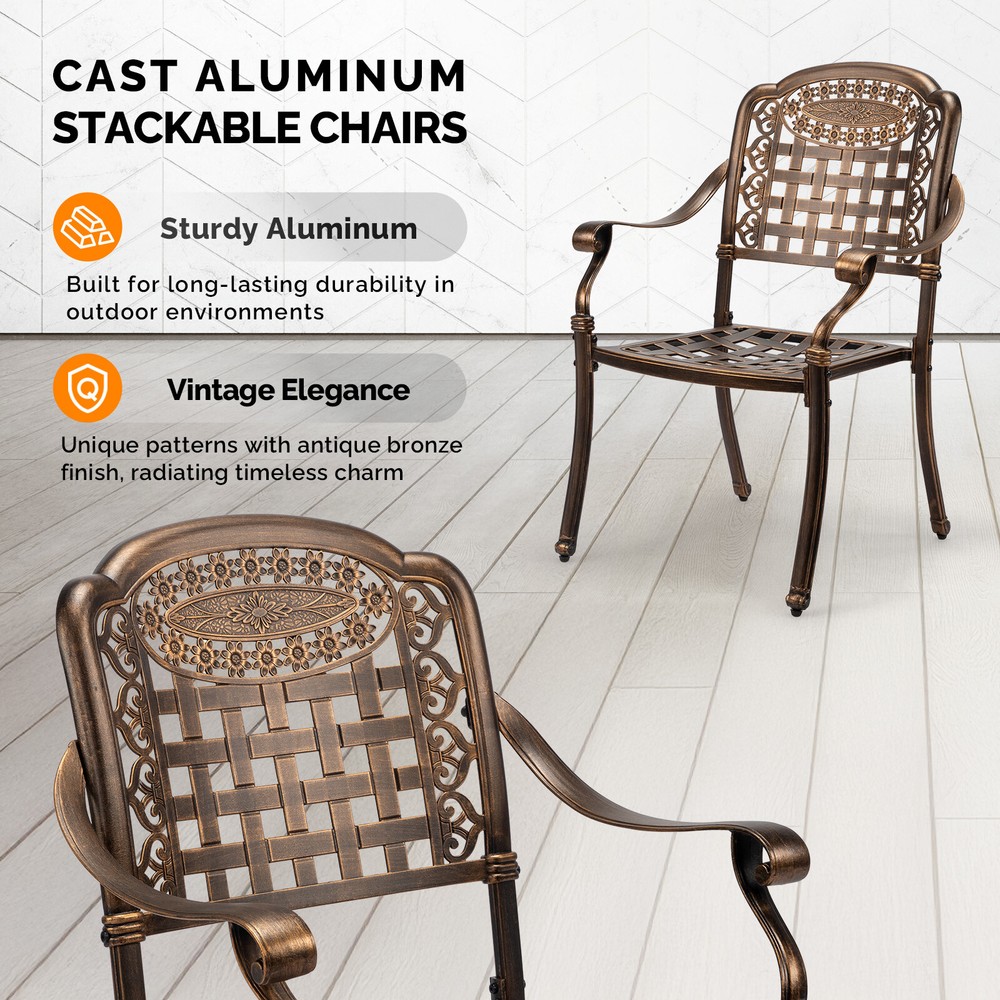 Absolutely love these patio chairs! The cast aluminum is sturdy and weather-resistant, perfect for my backyard. The vintage scrollwork adds a classy touch, and the curved design is surprisingly comfortable. Stackable for easy storage—great value for the price!