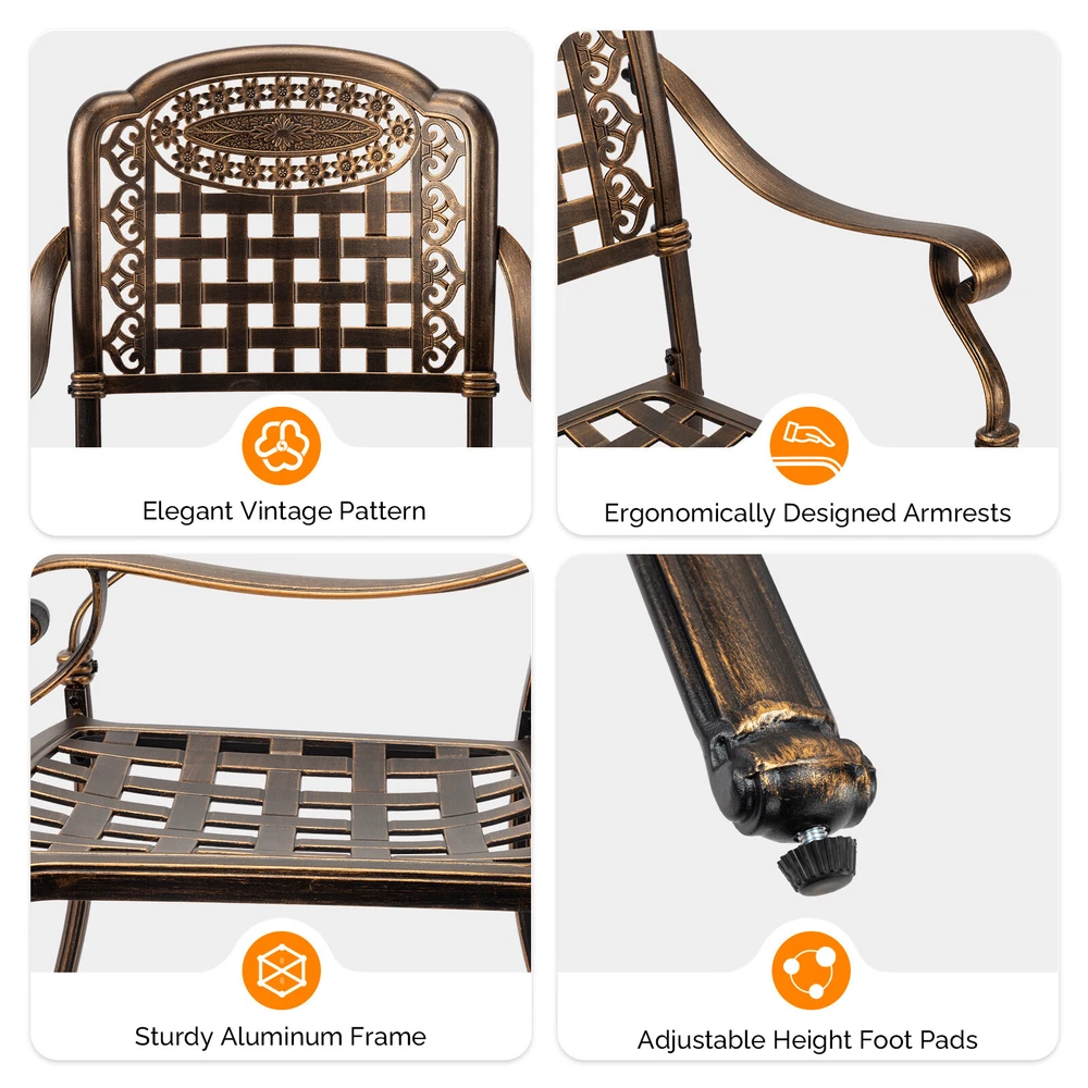 1.Durable Cast Aluminum Construction: Crafted with heavy-duty rust-proof cast aluminum, these outdoor patio chairs withstand harsh weather, rain, and UV exposure while resisting corrosion. Perfect for long-lasting use in gardens, poolside, or coastal areas 2.Vintage-Inspired Design: Elevate your outdoor space with intricate retro scrollwork on armrests and a timeless bronze finish. The metal patio chairs blend elegance with durability, complementing modern or classic patio décor 3.Ergonomic Comfort :Designed with curved contoured seats, cushioned support, and wide armrests for relaxation. Features adjustable leveling knobs on legs to ensure stability even on uneven surfaces like grass or gravel 4.Space-Saving Stackable: Lightweight yet sturdy, these outdoor dining chairs stack vertically for compact storage. Ideal for small balconies or seasonal use—save space without sacrificing style or functionality 5.Versatile Outdoor Solution: From backyard BBQs to poolside lounging, these aluminum patio chairs suit any setting. Use them as patio bistro chairs for meals or as standalone accent pieces in gardens, patios, or beach houses Specifications: 1. Dimensions: 26*25*36inch (WxDxH) 2. Net Weight: 26.4 lbs / 12 kg 3. Color: Bronze Package Includes: 2 x chair