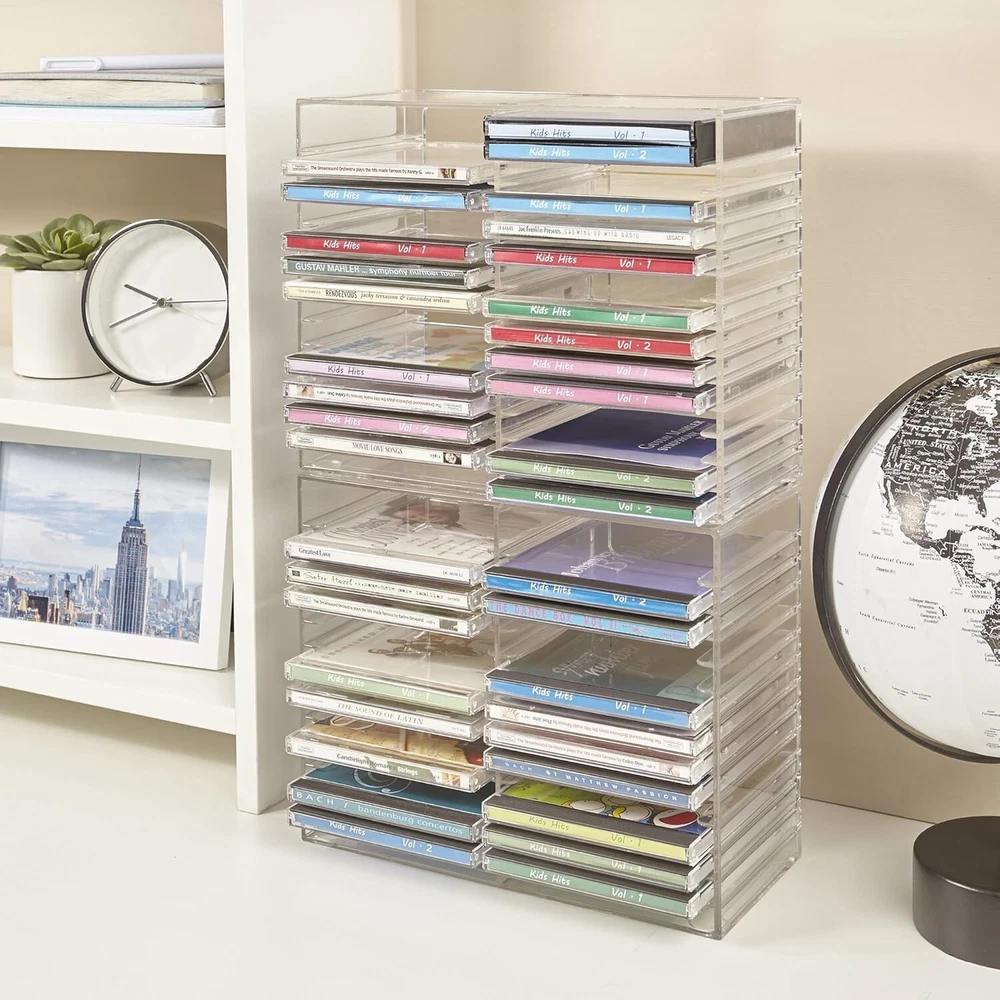 Stackable Clear Plastic CD Organizer with Rubber Feet | Rectangular Jewel Cases Holder Perfect for Theatre Room | Holds up to 30 CD Cases | Made in USA About this item American made with high-quality, durable BPA-free clear plastic . Domestic production of this CD organizer provides you with the peace of mind that you're buying a product that contributed less carbon emissions to the atmosphere from creation to delivery than those produced overseas. Say goodbye to cluttered media room shelves or office desks with these stackable CD holders . Designed to maximize space efficiency, they allow you to neatly organize and store your CD collection, freeing up valuable shelf or desk space. Each organizer easily accommodates up to 30 standard-sized jewel CD cases, including 2 double cases. Whether you're a music aficionado or a movie buff, you'll have plenty of room to store your favorite CDs without compromising on space. These organizers stack securely with the help of four rubber feet on the bottom of each unit. This ensures stability and prevents sliding or toppling, keeping your CD collection safe and organized at all times. Measuring 10.5" W x 4.875" L x 8.625" H, these CD organizers strike the perfect balance between spaciousness and compactness. Their rectangular design fits seamlessly on media room shelves or office desks, adding a touch of organization to your space.