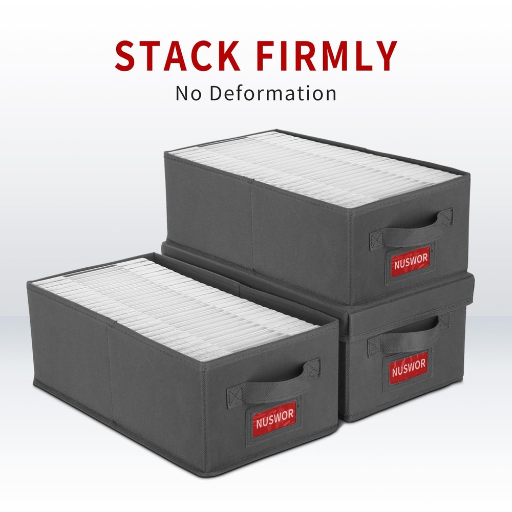 UPC: Does not apply Part Number: Usnwdvd3P2 Color: Grey Included Components: Box, Base Plate, Lid Size: 3Pack Package Dimensions LxWxH: 16.54x9.02x5.08 Inches Model Name: Dvd-3Pack Unit Count: 3.0 Closure Type: Flip Top Weight: 3.42 Pounds Item Shape: Rectangular gtin13: Does not apply Opening Mechanism: Hinge Brand: Nuswor Number Of Boxes: 1 Recommended Uses For Product: Store Dvd Item Package Quantity: 1 Number Of Compartments: 25 Type: Does not apply Model Number: Usnwdvd3P2 Material Feature: Thickened Non-Woven Fabric And Cardboard Material: Nonwoven And Cardboard Style: Minimalist