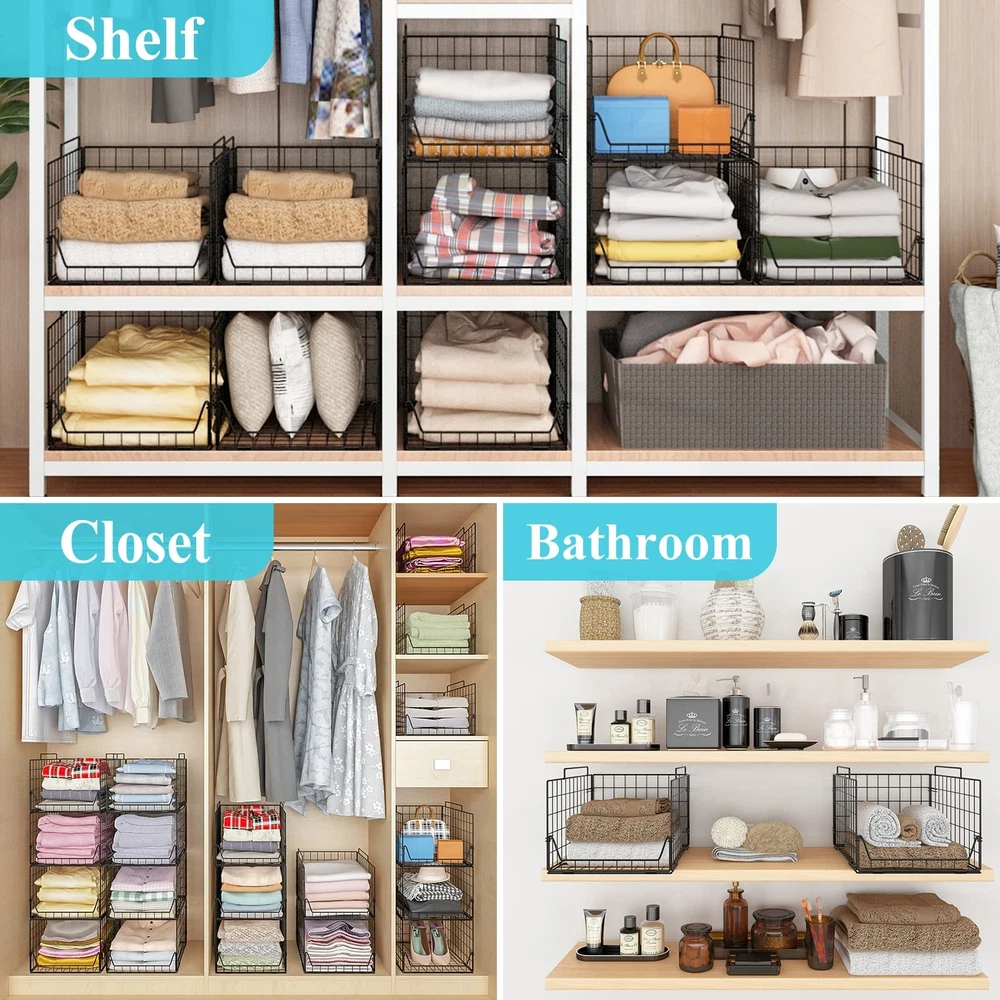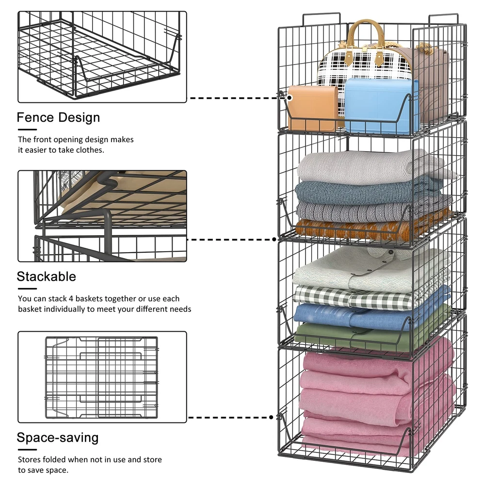 Elegant design that fits all home styles. Space-saving design Stores folded when not in use and make it easy to carry everywhere. Stores more with value pack of 4. These are foldable for easy storage when not in use. If your wardrobe always seems to be over flooding with clothes, it's time to make some changes. Our closet storage organizer makes the most of the vertical space in your closet to provide additional storage compartments. To clear the clutter and organize your closet, simply stow your clothes, shoes, hats, handbags and more into our organizer. Make your room and wardrobe organized. Clothes Organizers is Part of a Vast Right Wing Conspiracy Maximize closet space with Foldable 4 Tier Closet Organizer, which will add more shelving in your closet for folded clothes, pants, purses, shoes, hats or other accessories. Moreover, each basket can be used alone. You can hang them together on the wall or hang them separately or just place the basket on the flat surface. DIY the combination and using method! Come with 4 wide open baskets, maximize your closet space and a large capacity for storage clothes, socks, pants, dolls, and etc. Suitable for bedroom, closets, laundry room, play room, college dormitory Wide Open Design Rectangular shape with a low front and high back to keep your items neatly tucked away and easily accessible. use it in flat to store items anywhere like dorms, bathrooms, bedrooms, closets, office under the bed, in the garage or in the pantry. Fit for Any Room 4 Tier Metal Wire Basket is a great storage solution for any room in the home. Neat and organized: -- Large stackable capacity closet organizer baskets are perfect for the closet, can be used as closet storage bins, laundry room storage baskets, shelf storage baskets, nursery organizers. It will keep your closet organized, maximize your storage space. Take your closet organization to a new level and look for clothes at a glance and say goodbye to clutter! Easy to use: -- Modernist style, made of stainless steel, strong and durable. You can stack 4 baskets together or use each basket individually to meet your different needs. When not in use, easily fold up and store to save space. Multiple uses: --The foldable and durable storage basket can be placed in closets, shelves, bathrooms, laundry rooms, etc., to store clothes, pants, sweaters, socks, scarves, toys, books, laundry detergent and other items, easily stored. It is a great choice to keep your home tidy and beautiful. Put your clothes in: --Set of 4 for a great value. Individual basket size: 12.2" (L) x 16.22" (W) x 9.25" (H), stacked size: 12.2" (L) x 16.22" (W) x 35.03" (H). Large-capacity storage baskets is used in conjunction with the laminates to store a variety of items, keeping your storage space organized and both practical and beautiful. What you get: --Four wire baskets, easy to follow instructions, stackable and foldable design, organize your closet. If you have any questions, please contact us and we will get back to you within 24 hours.