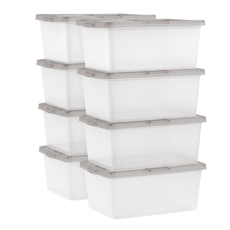 Finish: Smooth Pattern: Solid Print Item Weight: 1.05 lb Number of Compartments: 0 Item Height: 7 in Assembly Required: No gtin13: Does not apply Item Length: 16.44 in MPN: Does not apply Item Depth: 16.44 in Capacity: 17 Quarts & Below Style: Contemporary Brand: Unbranded Personalize: No Material: Plastic Type: Container Color: Gray Model: Does not apply Features: Stackable, With Lid Item Width: 11.75 in Size: Large Shape: Rectangle Original/Reproduction: Original Number in Pack: 8 UPC: Does not apply Mounting: Free Standing Theme: Home Storage & Organization Number of Items in Set: 8