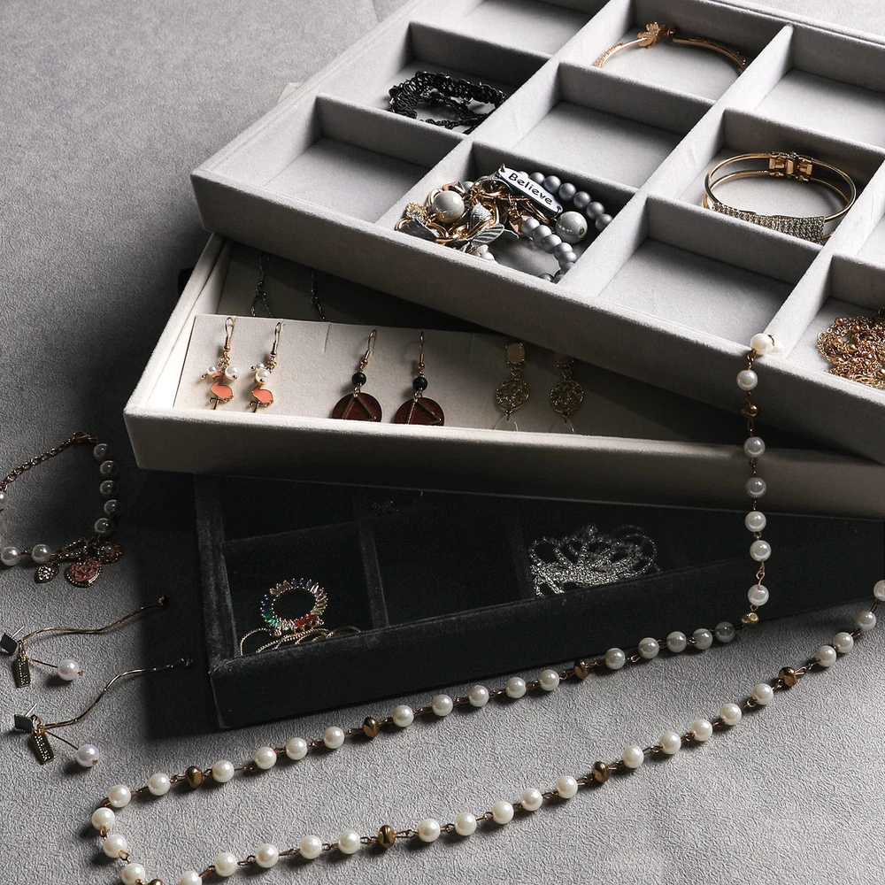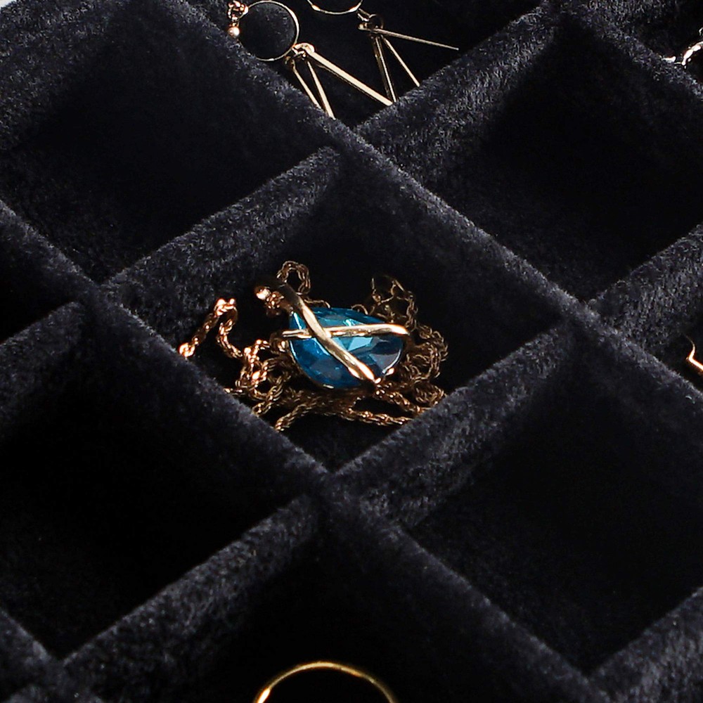 SET OF 2: The set includes 2 trays,12 Compartment Tray(1 pc) and 24 Compartment Tray(1 pc),Each tray measures 12.5x8.5x1.2,Convenient and roomy enough for you to store and wear your different jewelry. HIGH QUALITY VELVET MATERIAL: Our products are full covered with high-quality velvet,which feels smooth, looks elegant and soft enough to protect your jewelry from scratches and damage. STACKABLE AND ADJUSTABLE: Our jewelry trays can be stacked, easy to put on the dressing table or drawer, the dividers of the 12 grid and 24 grid trays are easy to remove to fit for your different size jewelry, Easy to organize and save space. SUITABLE FOR MULTIPLE SCENARIOS:You can put it on the dressing table or drawer to organize your personal jewelry like earrings, necklaces, bracelets, rings, brooches, pins, watches and so on., and it is also ideal for displaying a variety of beautiful jewelry in the jewelry store or trade shows. BEST GIFT:Such a practical and elegant jewelry tray is definitely a ideal gift for Anniversary,Mother’s Day,Birthday, Thanksgiving, Christmas to your girlfriend, wife, daughter, mother or any other important female in your life.