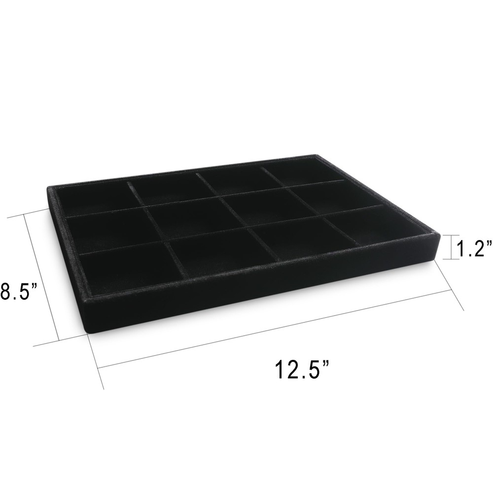 SET OF 2: The set includes 2 trays,12 Compartment Tray(1 pc) and 24 Compartment Tray(1 pc),Each tray measures 12.5x8.5x1.2,Convenient and roomy enough for you to store and wear your different jewelry. HIGH QUALITY VELVET MATERIAL: Our products are full covered with high-quality velvet,which feels smooth, looks elegant and soft enough to protect your jewelry from scratches and damage. STACKABLE AND ADJUSTABLE: Our jewelry trays can be stacked, easy to put on the dressing table or drawer, the dividers of the 12 grid and 24 grid trays are easy to remove to fit for your different size jewelry, Easy to organize and save space. SUITABLE FOR MULTIPLE SCENARIOS:You can put it on the dressing table or drawer to organize your personal jewelry like earrings, necklaces, bracelets, rings, brooches, pins, watches and so on., and it is also ideal for displaying a variety of beautiful jewelry in the jewelry store or trade shows. BEST GIFT:Such a practical and elegant jewelry tray is definitely a ideal gift for Anniversary,Mother’s Day,Birthday, Thanksgiving, Christmas to your girlfriend, wife, daughter, mother or any other important female in your life.