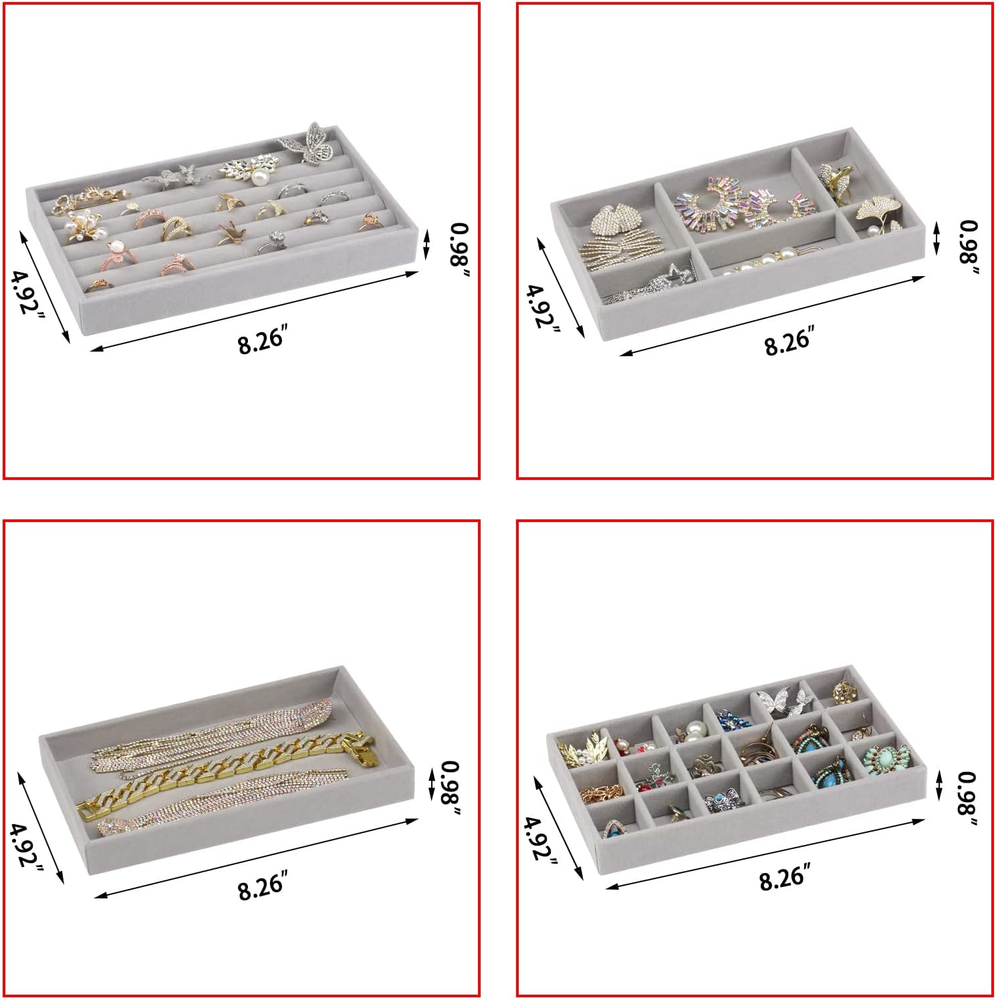 Store New Arrivals Add to Favorite View Feedback Contact Stackable Velvet Jewelry Trays Organizer for Drawers, Small Jewelry Drawer Organizer Display Tray for Earring Ring Watch Bangle Bracelet Necklace, Set of 4, Gray Description Style Modern Number of Compartments 2 Number of Items 1 Color Gray Target Audience Women Item Dimensions D x W x H 4.92"D x 8.3"W x 0.98"H Material Plastic Inner Material Velvet Item Weight 0.49 Kilograms Shape Square Recommended Uses For Product Earring Occasion Wedding, Birthday, Mother s, Valentine's Day Special Features Stackable Jewelry Storage Type Jewelry Tray Special Feature Stackable Product Dimensions 4.92"D x 8.3"W x 0.98"H Velvet Jewelry Drawer Organizer: jewelry trays are fully covered with soft velvet, simple and practical; removable dividers of two compartment trays help adjust grid sizes to accommodate jewelries of various sizes. Set of 4: the jewelry trays set comes in 4 pieces with different layouts, includes 6-Grid Tray(1 pc), Rings Display Tray (1 pc) , 18-Grid Tray(1 pc) , Blank Tray (1 pc); easily stores different jewelries like earrings, rings, necklaces, watches, bracelets, bangles, breast pin, brooches, hair accessories, etc. Small Jewelry Trays for Drawers: each tray measures 8.30" x 4.92" x 0.98" (LxWxH), fits in most drawers, dressers or shelves. Perfect gift for women and girls for Christmas, Birthday, Anniversary, Valentine's Day, Mother's Day. Stackable Jewelry Organizer Trays: 4 jewelry trays are stackable, perfect for home storage, trade shows or retail shops, can be Stacked to create more space for storage; making jewelries well organized and orderly stored. What You Get: 4 stackable jewelry organizer trays; if you're not satisfied with the trays set in anyway, if it breaks, if it's damaged in shipping, we'll help you the fastest to solve the problem. Product Description Ptaedex Velvet Jewelry Tray Set provides a wonderful display of your daily jewelry essentials in one place, small but sturdy, perfect to organize your bracelets, rings, earrings, watches, and necklaces, while eliminating tangled jewelry. Package Included: 4 small jewelry trays 18-Grid Tray x 1 Blank Tray x 1 Rings Display Tray x 1 6-Grid Tray x 1 Stackable Jewelry Trays Organizer 4 jewelry trays are stackable, perfect for home storage, trade shows or retail shops, can be Stacked to create more space for storage; making jewelries well organized and orderly stored. Velvet Jewelry Trays for Drawer Small dresser drawer organizers are fully covered with soft velvet, perfect for you to protect your jewelry from damages and scratches. DIY the Storage Space The inner dividers of the 6 and 18 compartment jewelry trays are removable, you can adjust the size and number of compartments to store large jewelry. Best Gift for Her A perfect gift for your girlfriend, wife, mother, daughter, friends and so on. It is also a good idea of Valentine's Day Gift, Birthday Gift, Mother's Day Gift, Christmas's Gift, Wedding Gift, Engagement Gift, Anniversary Gift and etc. Quick Access to Everyday Jewelries Designed to keep the daily needed jewelries stored conveniently and organized. Making it easy to find the jewelry you want in seconds. ABOUT US We offer the best prices around on high quality products. Our E-store includes media such as books, movies, music and games while offering electronics, toys, sporting apparel, clothing, tools, general home, garden items and more. SHIPPING We are always working hard to ensure your package arrives as soon as possible. Please understand that some factors like weather, high postal traffic, and the performance of shipping companies are outside of our control. We offer free shipping to the lower 48 states and ship within 2 business days of payment, usually sooner. We do not accept P.O. Boxes. Please provide a physical address. RETURNS We offer a 30-Day Return Policy on items which you are not completely satisfied with. You have the option for a full-refund or an exchange of the item. No returns are available on items shipped outside of the USA. PAYMENT We accept PayPal. CONTACT US This page content is yet to come Please ad us to your favorite seller and visit again later Thank You CUSTOMER SATISFACTION We try our very best to make sure every customer is completely satisfied. If there's a problem, message us! We're happy to help.