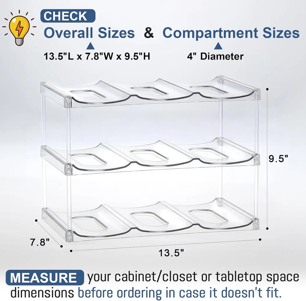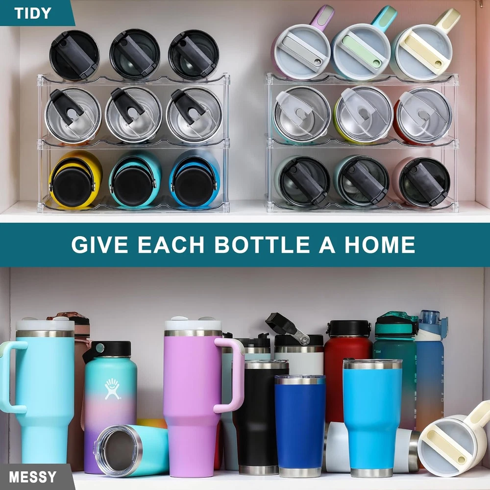 Store New Arrivals Add to Favorite View Feedback Contact Our warehouse is located in US, please rest assured you will receive your items in the shortest time. ★Large Compartment Fits Large Bottles or Tumblers - Unlike most water bottle storage products, we gathered customer complaints that what they have bought doesn't fit common large size water bottles. We improved it so that each compartment grid measures 4" wide and 4 " high, perfectly fitting some large water cups or bottles up to 40 OZ. ★For Example - for YETI or STANLEY Brand 30oz insulated tumbler; for Nalgenes Brand 32oz wide mouth water bottle; for Hydro Flask Brand 32oz/40oz wide mouth bottle; for STANLEY Brand 40oz insulated tumbler with handle, etc. ★Quick Assembly and Stacking - No tools required, just 1 minute to assemble. The water bottle storage holder rack are easily stackble and can be freely split and combined, you can assemble any tiers you want to maximize the space, such as 1 tier, 2 tiers, 3 tiers, 4 tiers, 5 tiers, 6 tiers and more. ★Simple 3-Tier Bottle Storage Holder Rack - Size: 13.5" L x 7.8" W x 9.5" H, hold 9 bottles. Modern, stylish and chic design complements any interior. Fits most household water bottles or tumblers, like glass or plastic water bottles, sport bottles, insulated travel mugs or tumblers, baby bottles, kids sippy cups and many more. Ridges on both sides prevent bottles from rolling and give each bottle a room. ★High Quality Clear Material and Solid Construction - Each shelf is made of thick clear plastic. Each tier is tightly connected by 4 sturdy solid posts. The 3 tier water bottle holder can hold up to 30 lbs each tier without wobble or crack. (Note: not dishwaher safe) ★Versatile Home Storage and Organization - Not only can you use it for water bottle storage in cabinet or counter top, but also for other scenarios such as pantry or fridge shelf, cupboard, wine cellar, under sink closet, kitchen or office countertop, bar, rv etc. You can use it to store many cylindrical items such as sodas, drinks, cans, toiletries, bottled condiments, wine displays and more. Product Description LANDNEOO BRAND WATER BOTTLE ORGANIZER Add to Cart Add to Cart Add to Cart Add to Cart Add to Cart Add to Cart Add to Cart Customer Reviews 4.7 out of 5 stars 1,043 4.7 out of 5 stars 1,351 4.7 out of 5 stars 1,043 4.7 out of 5 stars 1,043 4.7 out of 5 stars 1,351 4.7 out of 5 stars 1,043 4.7 out of 5 stars 1,351 Price $16.99 $ 16 . 99 $14.99 $ 14 . 99 $14.99 $ 14 . 99 $19.99 $ 19 . 99 $17.99 $ 17 . 99 $12.99 $ 12 . 99 $11.99 $ 11 . 99 Color Clear Clear White Clear Clear Clear Clear Fit Small & Large Tumblers ✔ ✔ ✔ ✔ ✔ ✔ ✔ Freely Split & Combined ✔ ✔ ✔ ✔ ✔ ✔ ✔ Be Freestanding & Stable ✔ ✔ ✔ ✔ ✔ ✔ ✔ Food Grade Material ✔ ✔ ✔ ✔ ✔ ✔ ✔ Please Check the Diamensions Before Ordering Overall Size - 13.5"L x 7.8"W x 9.5"H. Compartment Size - 4" Diameter Please check the overall diamensions & compartment size and measure your cabinet/closet or tabletop space dimensions before ordering in case it doesn't fit. Overall Size - 13.5"L x 7.8"W x 9.5"H. Compartment Size - 4" Diameter Please check the overall diamensions & compartment size and measure your cabinet/closet or tabletop space dimensions before ordering in case it doesn't fit. Fit Large Tumblers Bottles Premium Quality Multiuses WINE DISPLAY RACK CAN OR SODA DRINKS STORAGE TOILETRIES STORAGE