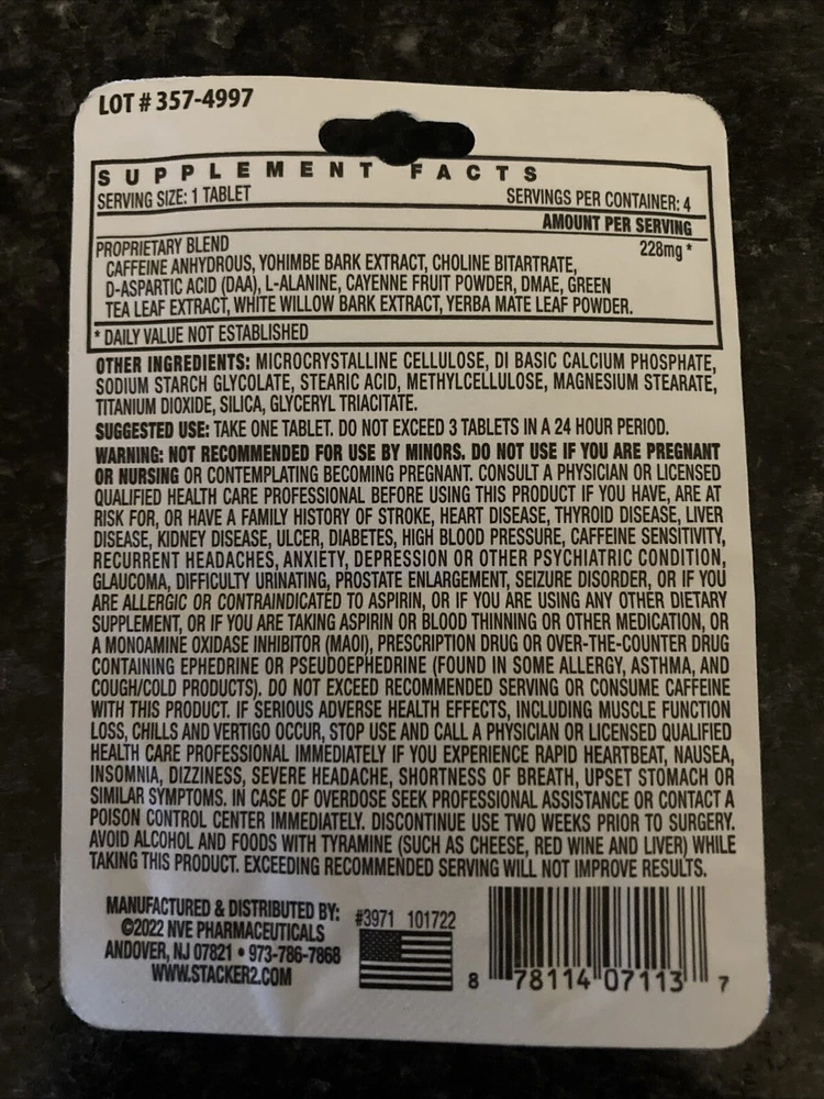 # of Capsule:4Problem, Benefit:Energy, Weight LossType:SupplementMain Purpose:Weight Loss, Weight ManagementSubject:Weight Loss AidStyle:PacketFormulation:TabletSports Supplement Type:Fat BurnersMPN:NOT SPECIFIEDActive Ingredients:CaffeineCountry/Region of Manufacture:United StatesBrand:Stacker 2Vitamin, Mineral Product:Weight Loss