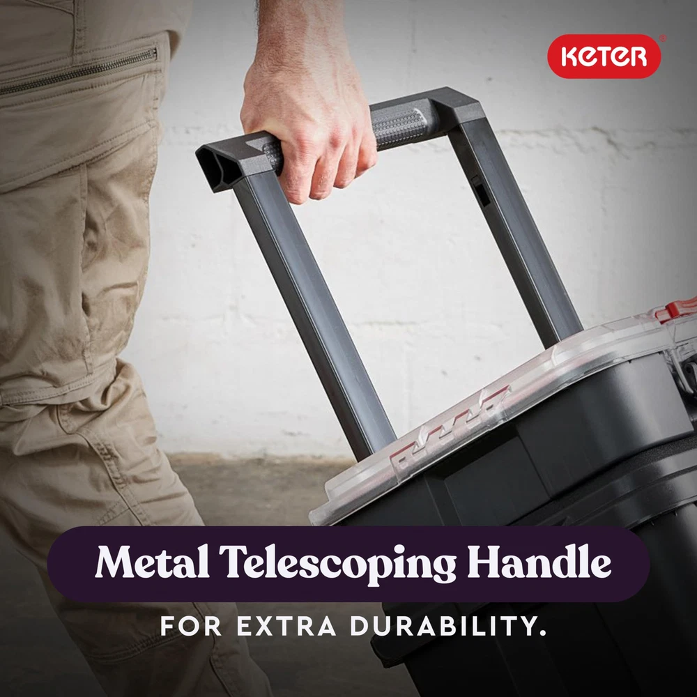 The Stack-n-Roll Modular Tool System offers a practical storage solution for your hand tools, power tools, and all types of hobbies or home DIY use. It is perfect for keeping your important stuff organized and accessible at the same time. The biggest feature is its interlocking modular connectivity within all 3 pieces included. This allows you to finidh your job and put away all your tools that minimizes space and will keep you organized. A drawer lock bar means you’ll never have to worry about drawers slipping out when you’re on the move (lock not included). Made from sturdy and durable resin, this lightweight drawer unit is built for frequent use. Durable and Lightweight construction makes this modular tool storage system perfect for home use The system is an interlocking, customizable, mobile workshop that includes a cart, toolbox and organizer Snaps close wit audible latches that confirm your contents are secure Metal telescopic handle with 7” durable wheels and side grips for maximum mobility to your next project or jobsite Features a transparent polycarbonate lid on the small parts organizer