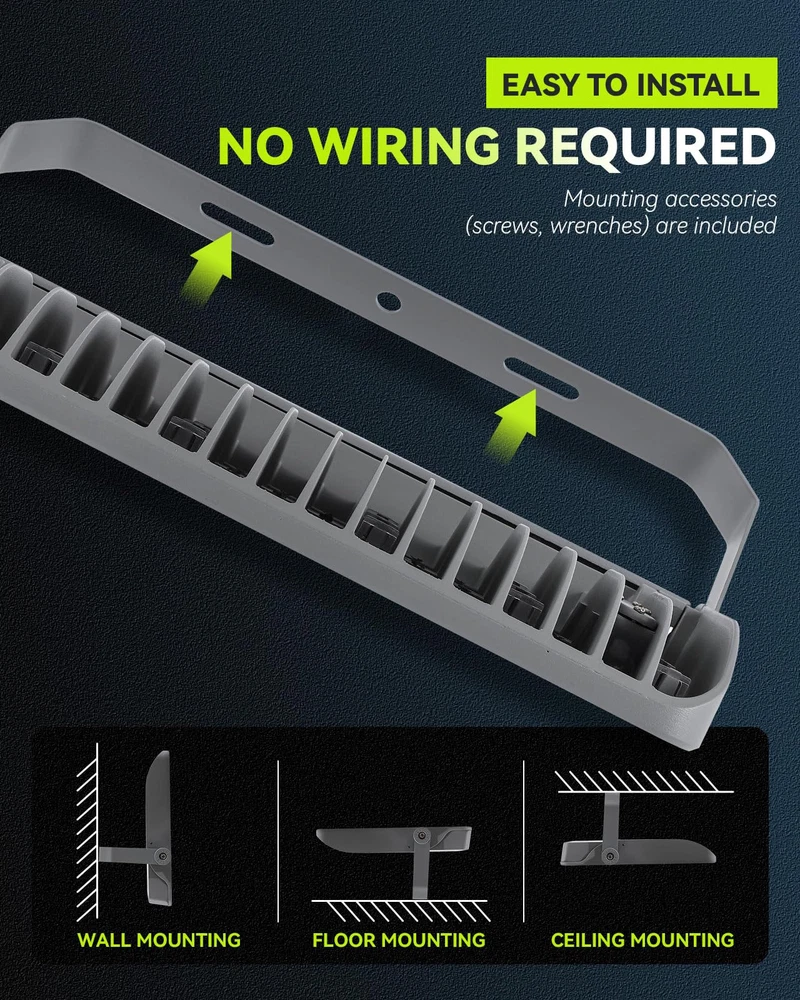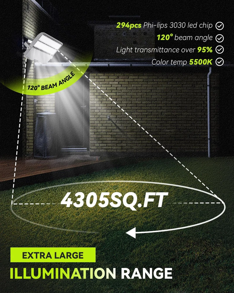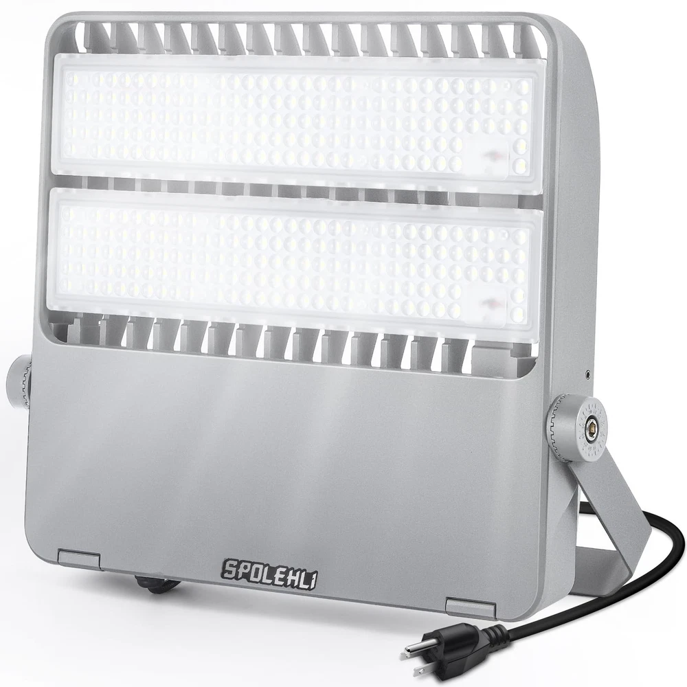 HIGH CONFIGURATION & LOW USE: This stadium light is equipped with Phi-lips 3030 high light beads with brightness up to 180LM/W and Mean-well LED driver, plus UL listed power cord and US plug, which significantly improves the service life and lighting efficacy, with guaranteed quality. Brightness 36000LM with low power consumption of only 2.0 Amp, saving 90% of your electricity bill. SCIENTIFIC DESIGN & GREAT VALUE: This flood light is integrated aluminum alloy die-casting molding, using high-quality engineering-type materials and parts, it is backed by a thickened finned radiator design, which means it acts like a heat sink to dissipate heat, ensuring good heat dissipation and long-lasting performance with a lifespan of over 50,000 hours, save on maintenance. EXTRA LARGER LIGHTING RANGE: With 294pcs high brightness Phi-lips 3030 led chip, 120° beam angle, Anti-UV optical polycarbonate lens with light transmittance over 95%, this daylight white flood light will literally light up the world around you, it can highlight the beauty of your outdoor space, your garden or the architectural features of your home. Color temperature 5500K, like midday daylight. Recommended installation height 26.2~39.4Ft (8~12m). READY FOR ALL WEATHER: Our LED Stadium Light are specifically designed to illuminate sports fields and other outdoor locations, they are IP66 waterproof, heat and frost resistant, and can work properly in temperatures ranging from -13 to 122°F(-25 to 50℃). They are brighter than typical outdoor flood lights and provide a more focused beam of light that can be pointed exactly where it is needed. CONVENIENT INSTALLATION: This floodlight comes with a 180° adjustable angle bracket that can be installed in many mounting positions at almost any angle, it can be ceiling mounted, wall mounted and floor mounted. Easy and convenient installation means you don't need to be a professional electrician to install our outdoor floodlights, you can do it yourself with a few basic tools that included in the package, which saves you time and cost.