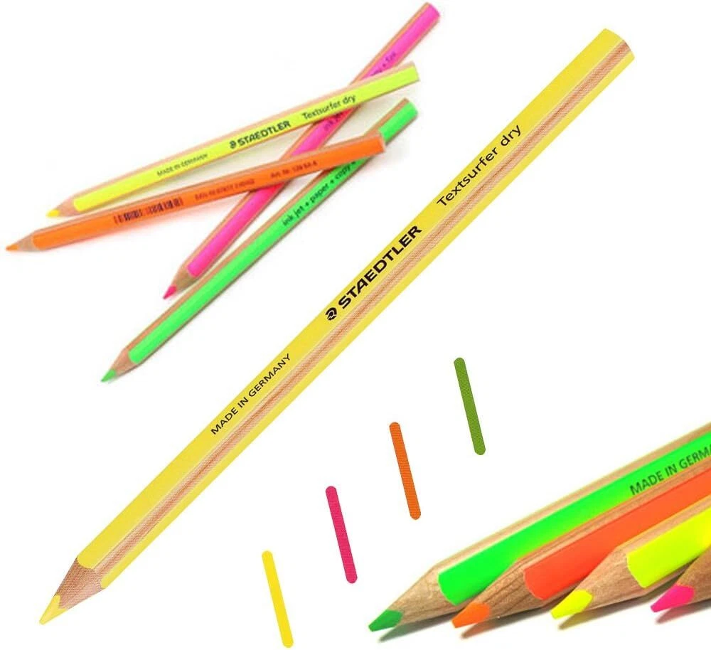 Staedtler Textsurfer Dry Highlighter Pencil 128 64 Drawing for Writing Sketching Inkjet,Paper,Copy,fax(Pack of 4) (Color Mix-4 Pencils) by Staedtler Product Details Brand: STAEDTLER Ink Color: Multicolored Number of Items: 4 Point Type: Chisel Recommended Uses For Product: Drawing,Sketching