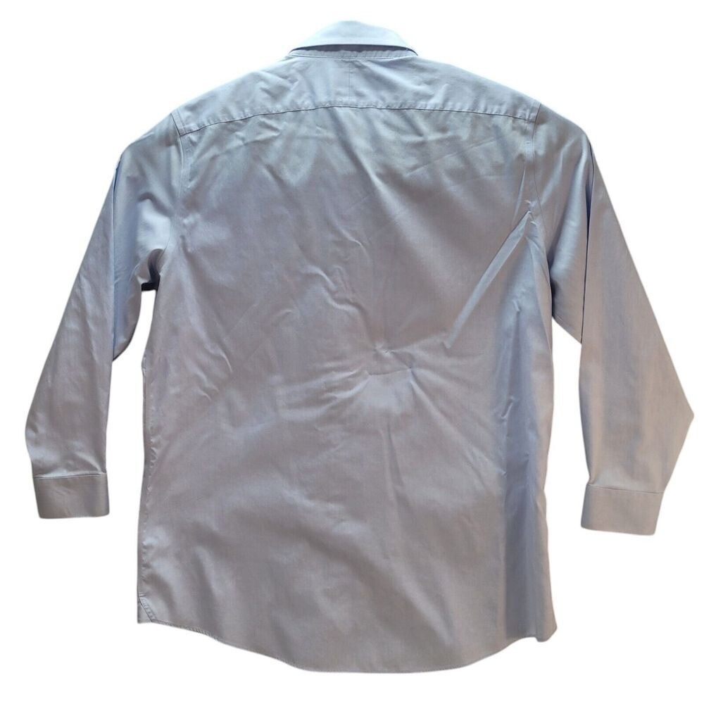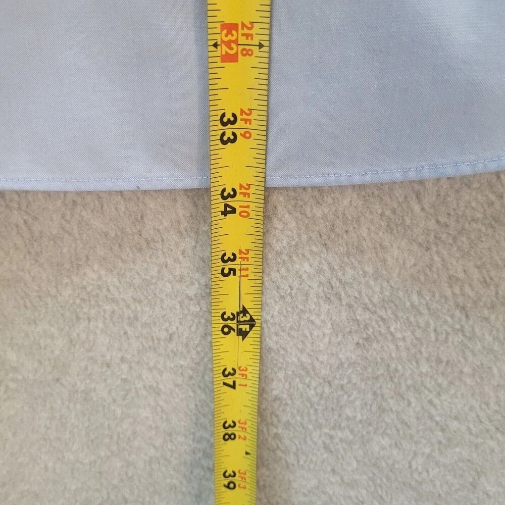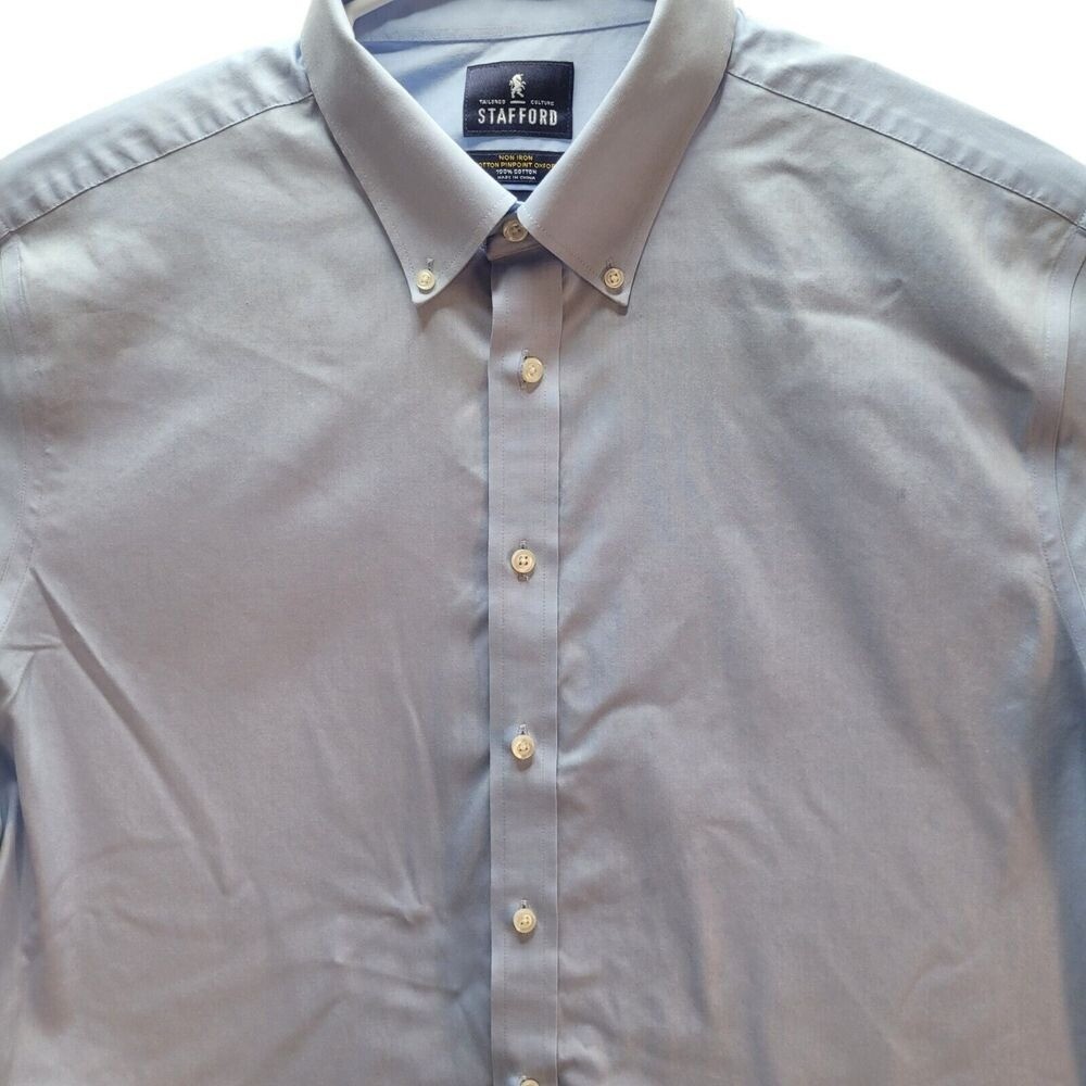 Stafford Dress Shirt Men's Sz 17.5 Long Sleeve Button Up Oxford Non Iron Blue Elevate your formal or casual wear with this Stafford dress shirt. The collared neckline and button-down closure make it suitable for any occasion, whether it be workwear or a business meeting. The shirt is made of a comfortable and durable polyester, cotton, and cotton blend fabric, with a solid blue pattern and long sleeves. It features a non-iron material, making it easy to maintain and machine washable. The shirt has a regular fit, with a chest size of 48 inches and a neck size of 17.5 inches. The top cuff style is a barrel cuff, with accents of buttons and a classic theme. This dress shirt is perfect for any man who wants to look sharp and feel comfortable.